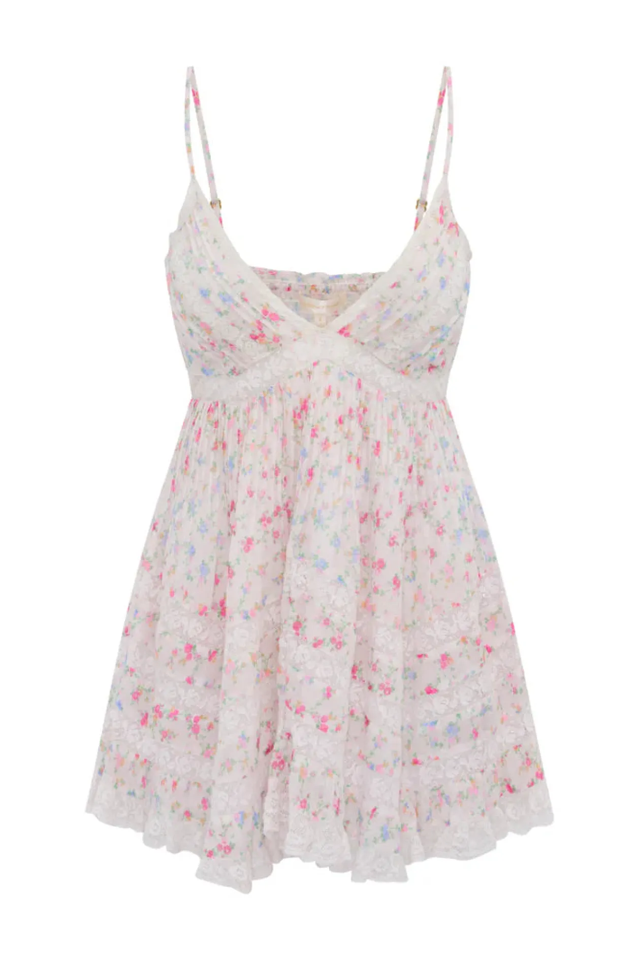 Feeling sweet in the Alonna Dress. This Victorian-inspired dress stuns with a lightweight cotton voile fabric printed with a ditsy floral print and a contrast of white laces throughout. This strappy, v-neck mini features an empire waist that releases into a slight handkerchief hem skirt. There’s smocking at the back for ease and comfort, tucking at the waist, and includes pockets.