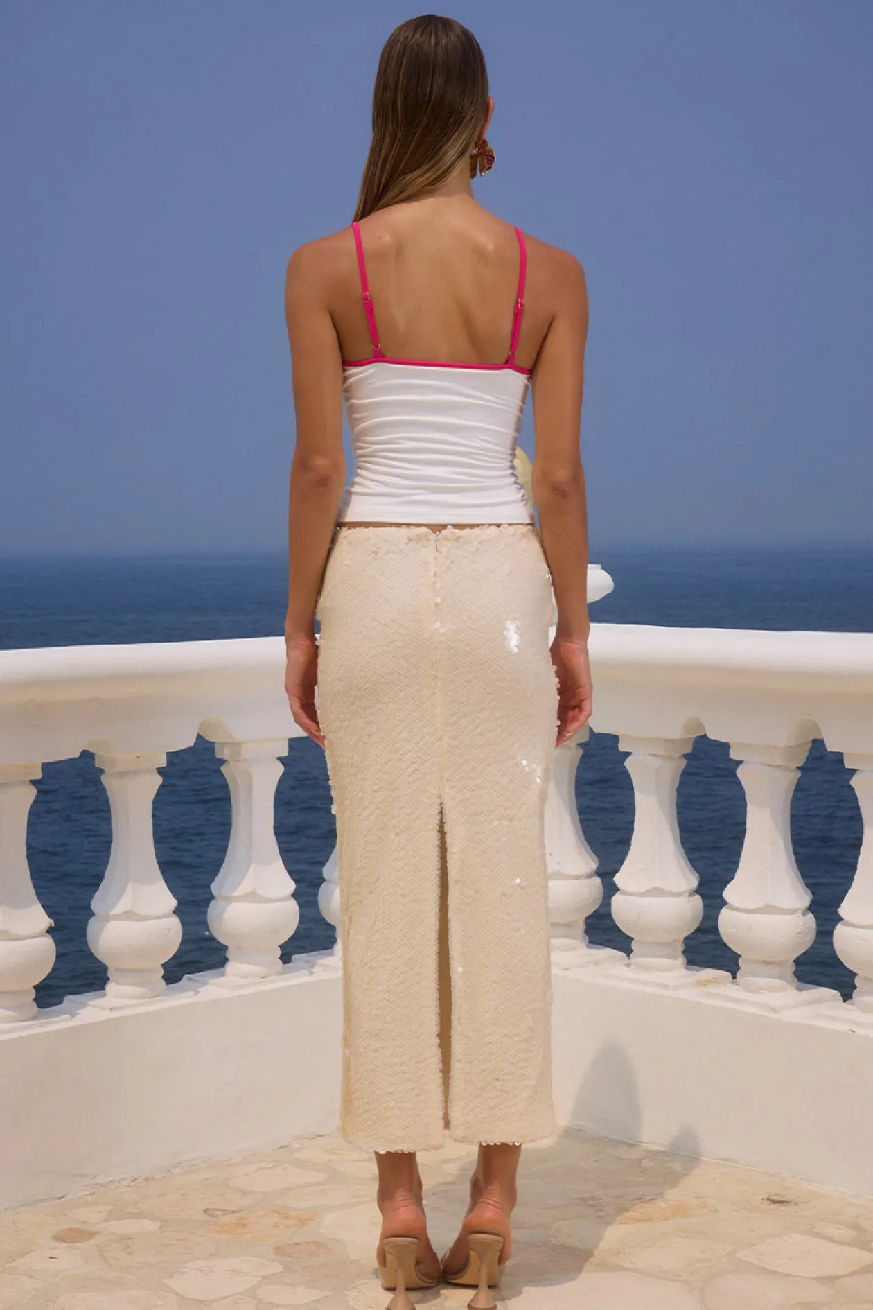 Our Athena Midi Skirt sits low waisted, adorned with pearlescent sequins to add instant glamour to any look, pair with our Sedona Tank for a complete look.