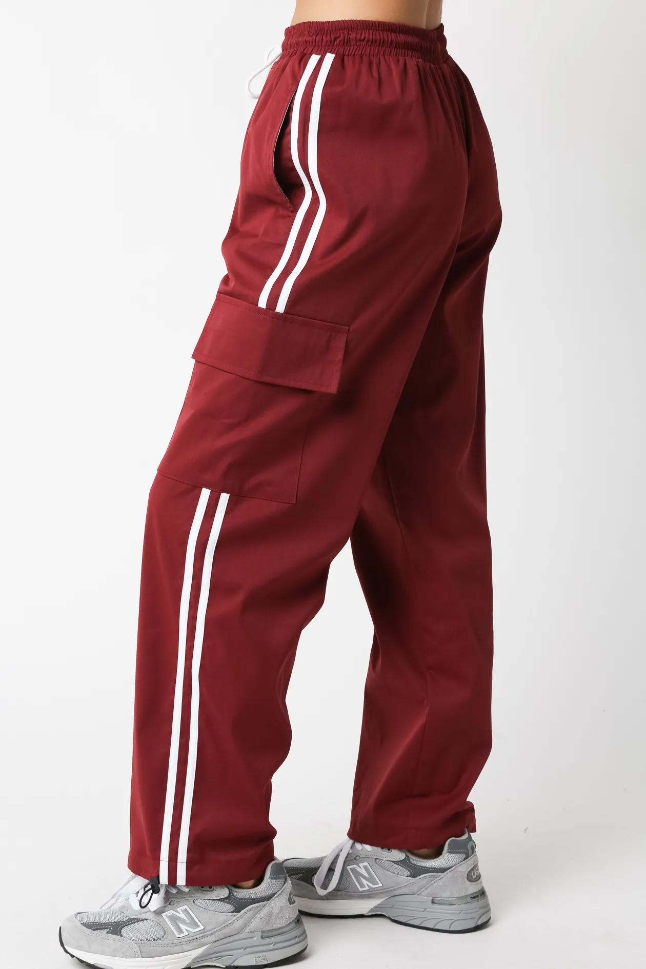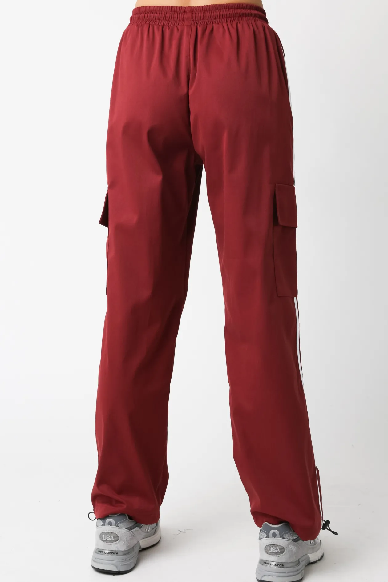 Elevate your casual style with our Brett Pants. Featuring adjustable bungee-style ankles and white detail stripes, these stylish burgundy color sweatpants are perfect for any look. Dress them up with heels and a tank top or keep it casual with sneakers. Versatile and chic, they’re a must-have for your wardrobe.