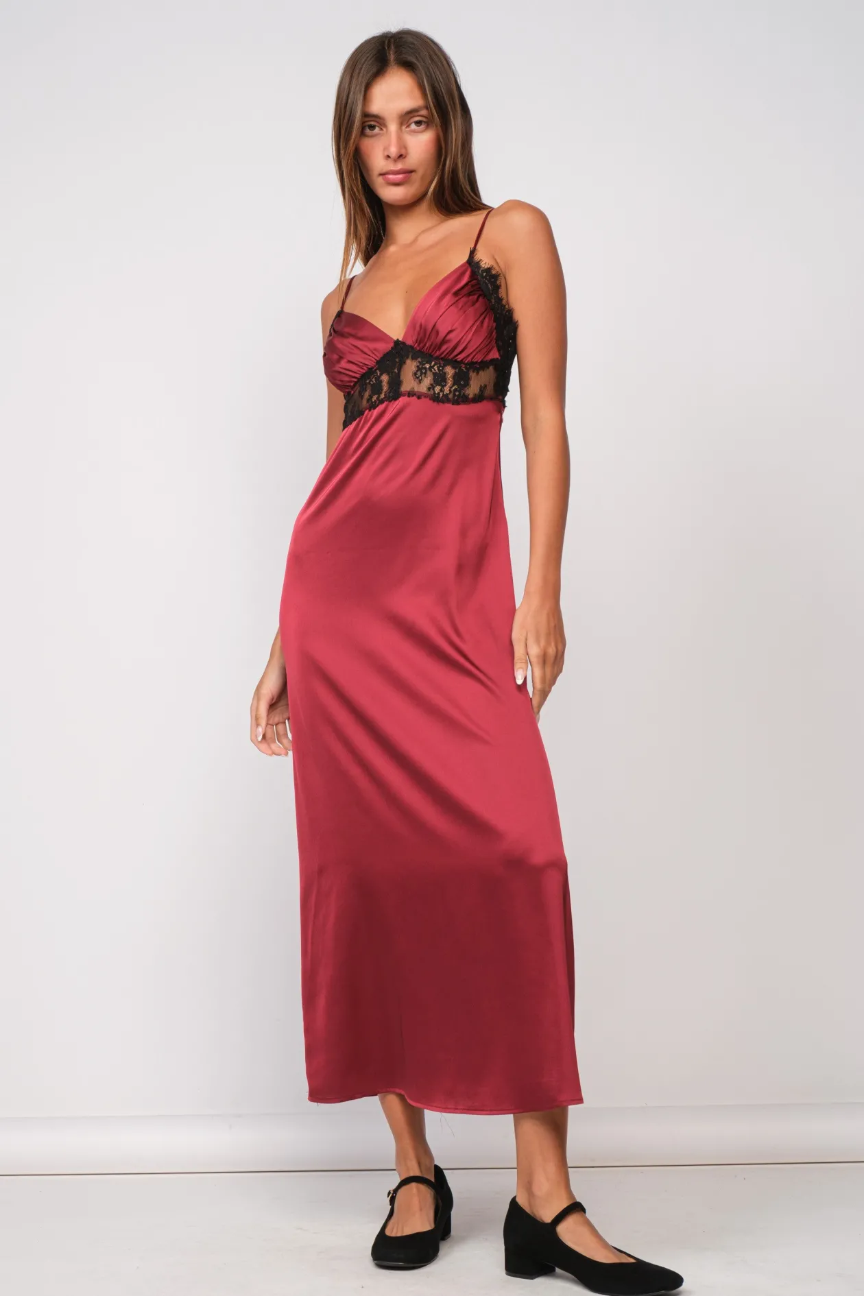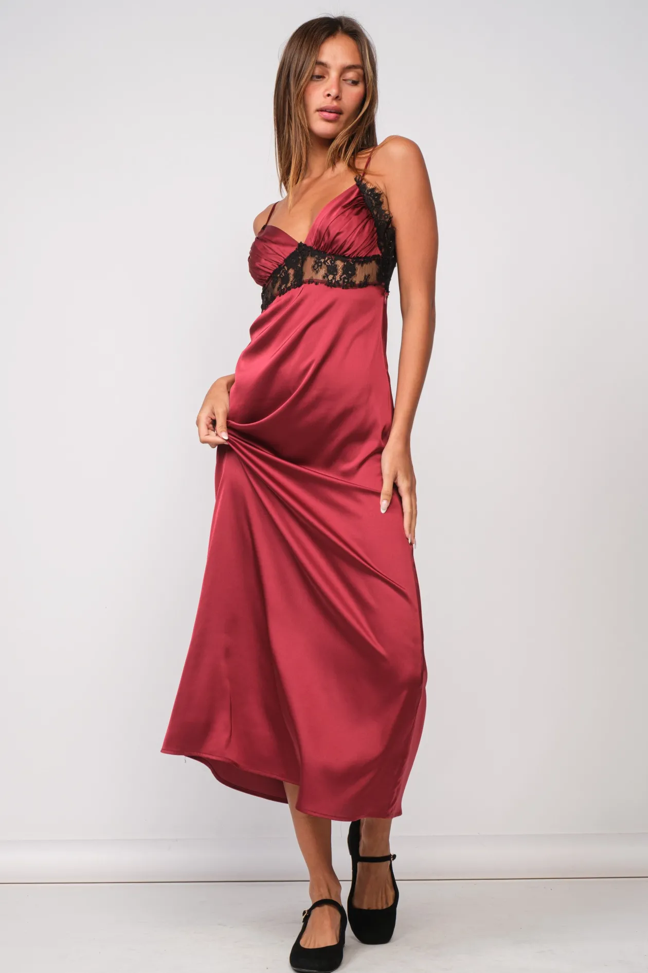 Burgundy satin midi dress with black lace trim detailing.