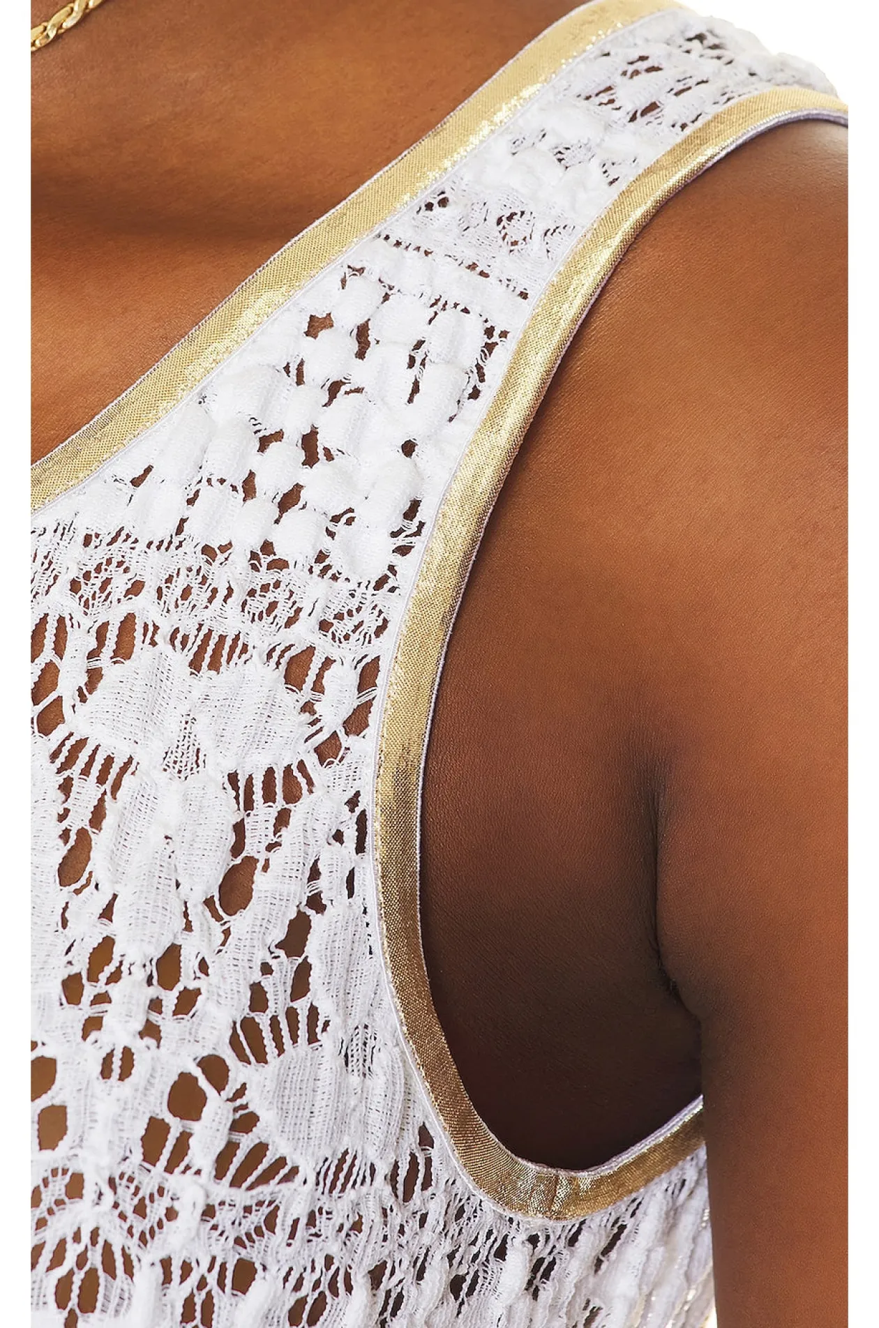 Gold-tone threading at trim. Knit fabric at bodice. Linen fabric at skirt. Partially lined Pull-on Styling.