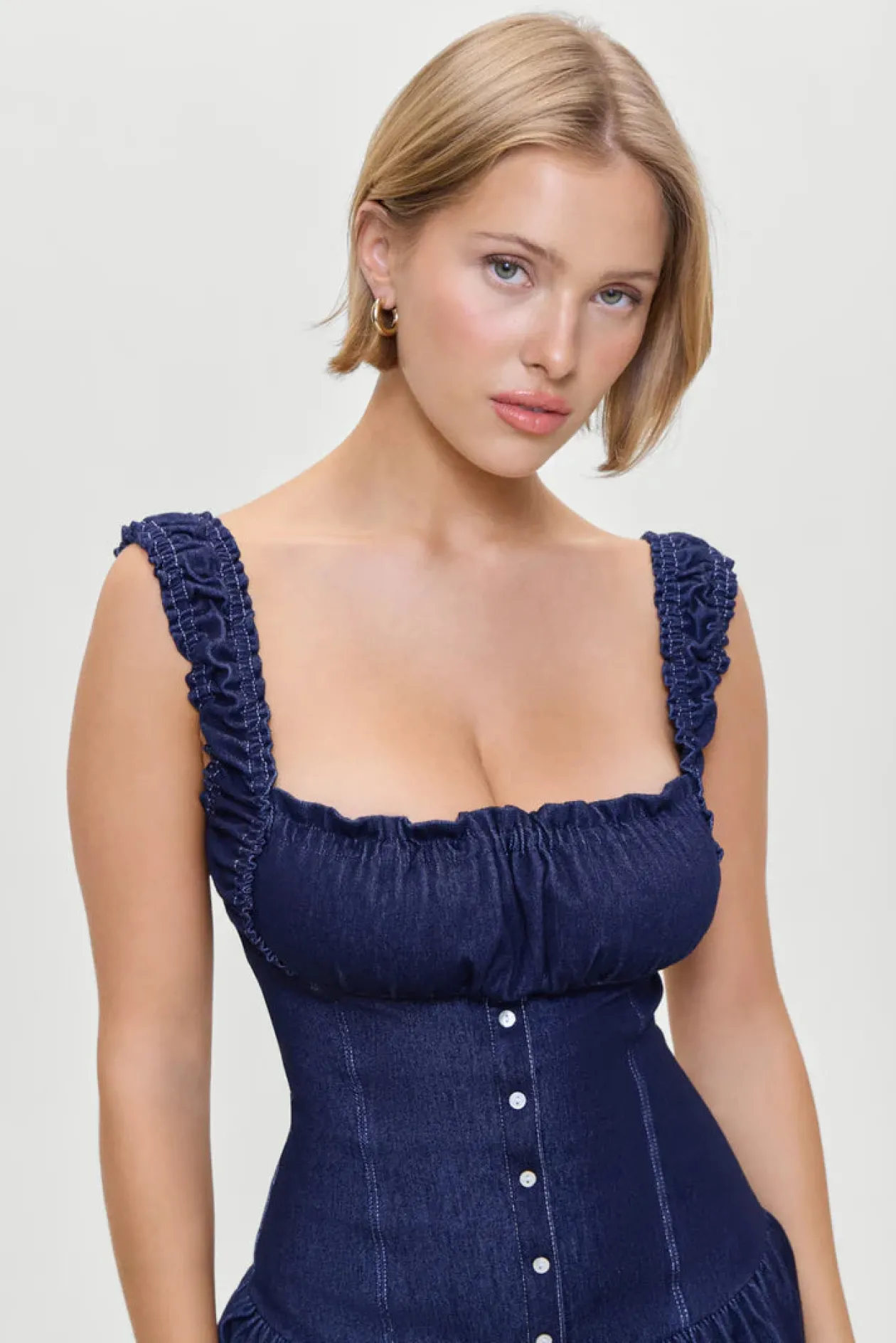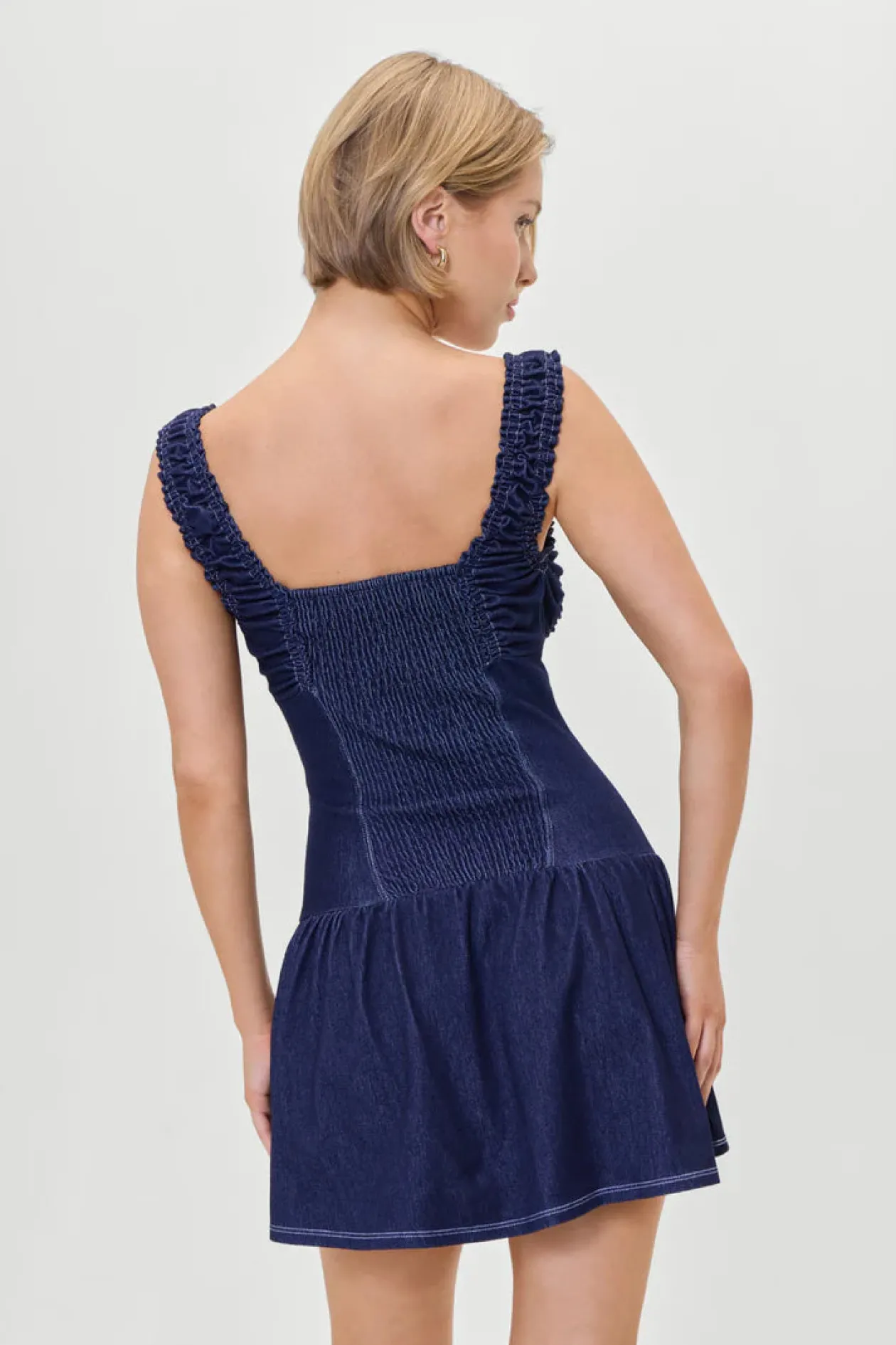 Spring mini-dresses don’t get cuter than this… Meet Christa, a mini dress made for sunny spring days. This prairie silhouette is designed in a new soft stretch denim fabric.
