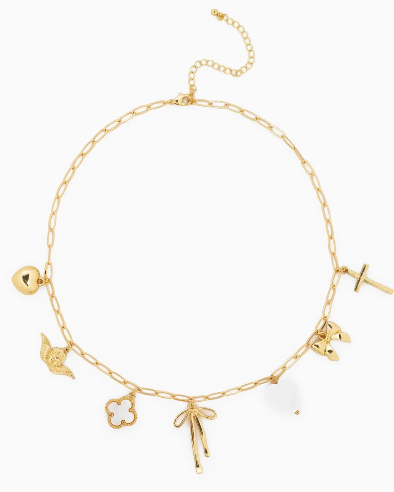An adorable bow is the centerpiece of this gold charm necklace, accentuated by a white heart, clover, cross, and angel – adding a playful and whimsical touch to this charming piece. An adorable addition to the charm jewelry trend.