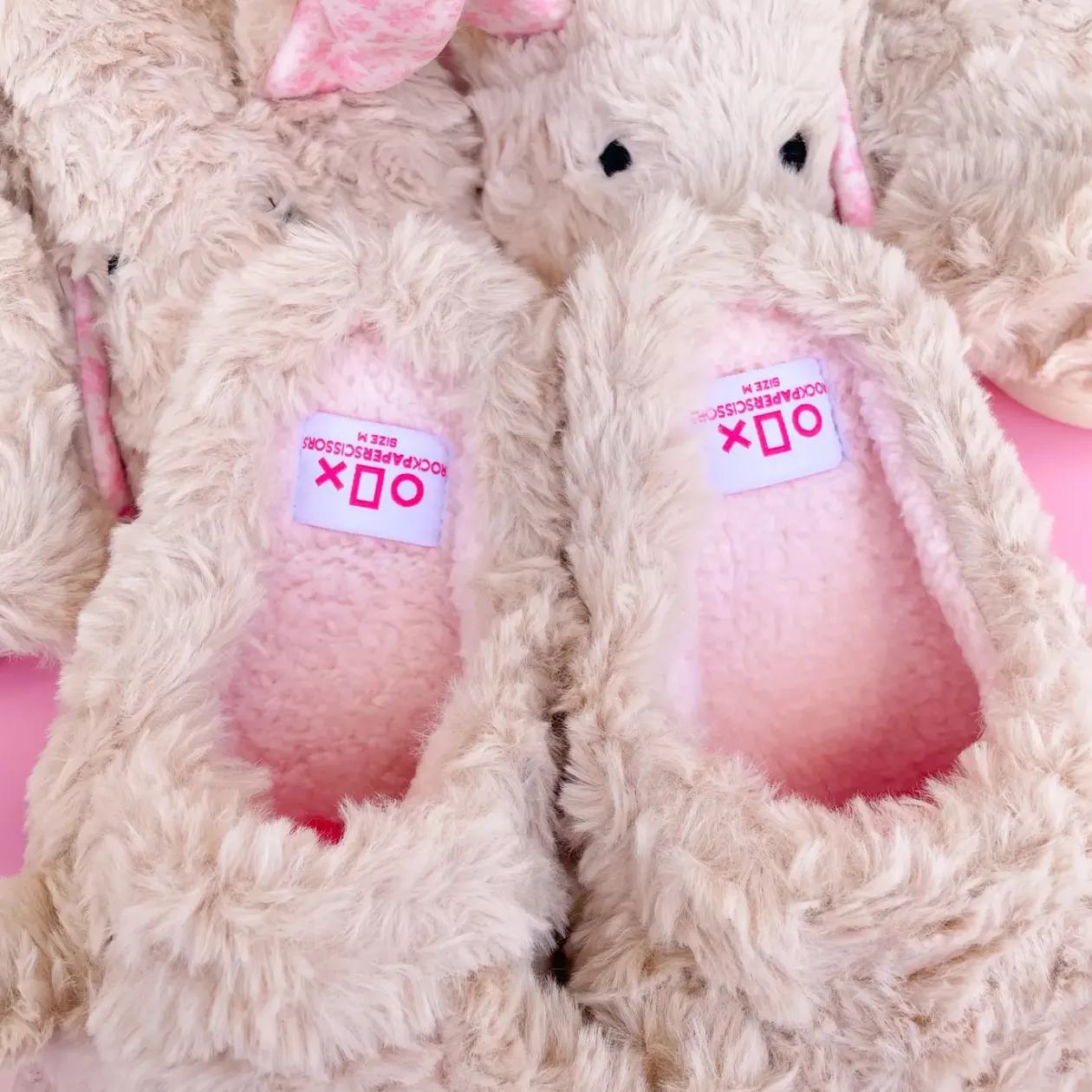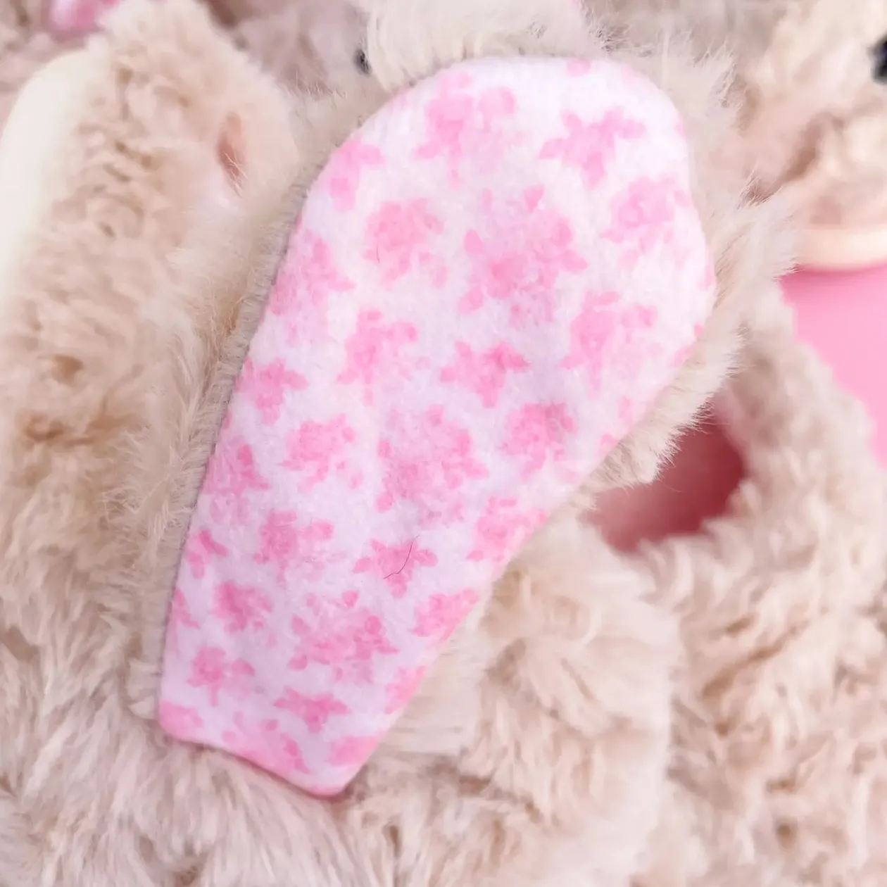 - Floppy ears with sweet pink floral pattern inside