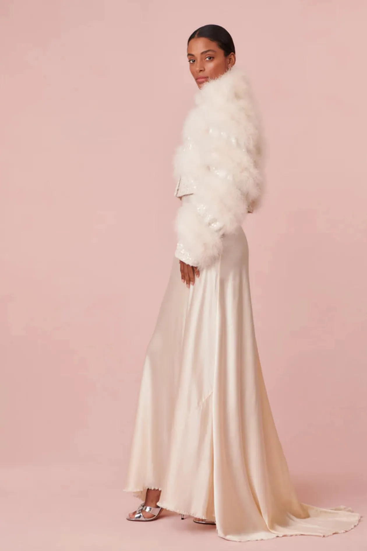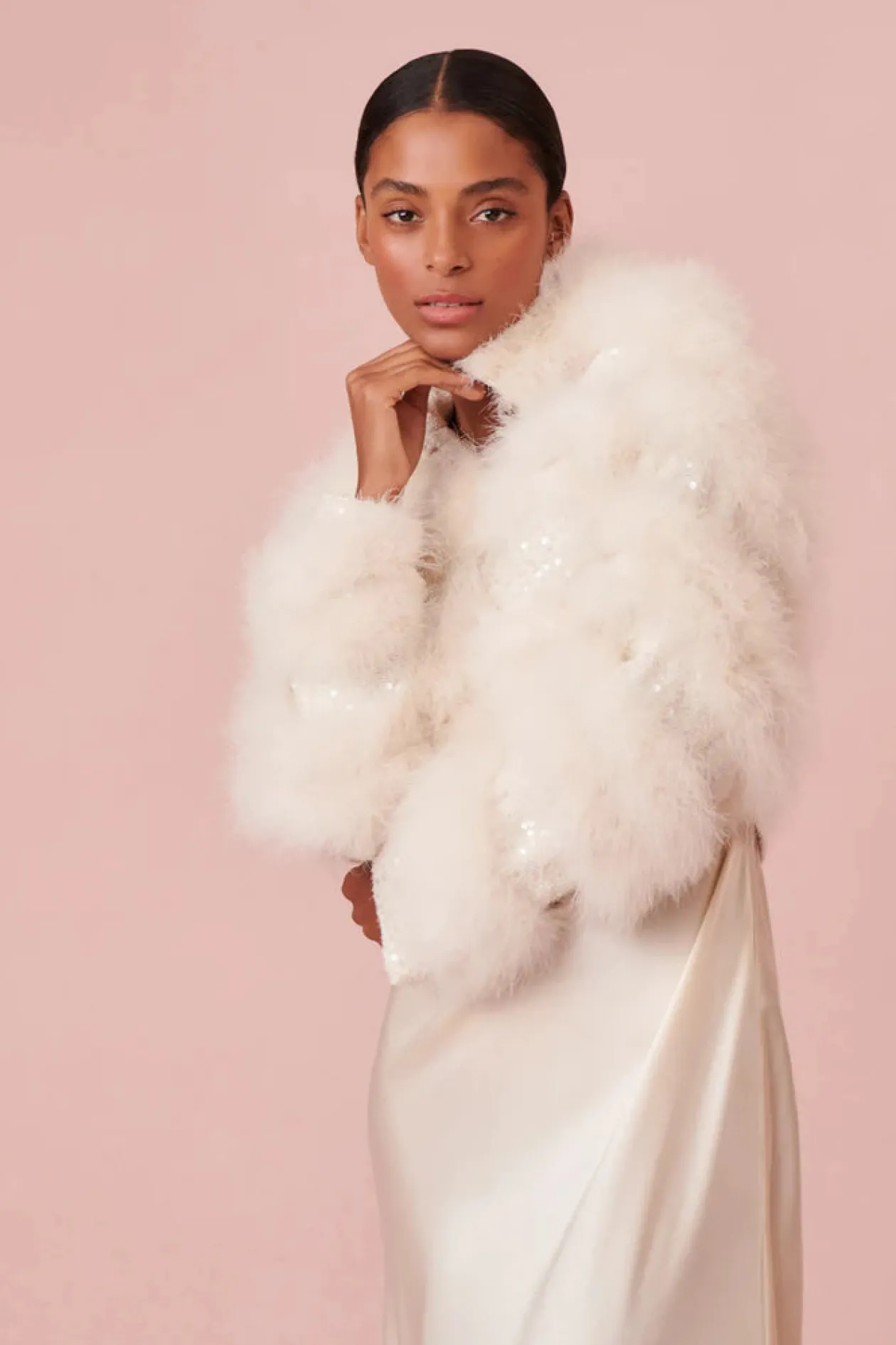 Winter chic in the Curran Jacket. This dreamy outerwear is designed with a beautiful sequin tweed shell with layered bands of soft, marabou feathers. This holiday statement piece has a flattering silhouette that hits at the waistline, comes fully lined, and includes a hook and eye closure on the interior. Pair with your favorite vintage jeans or mini for a full look. The jacket comes fully lined.