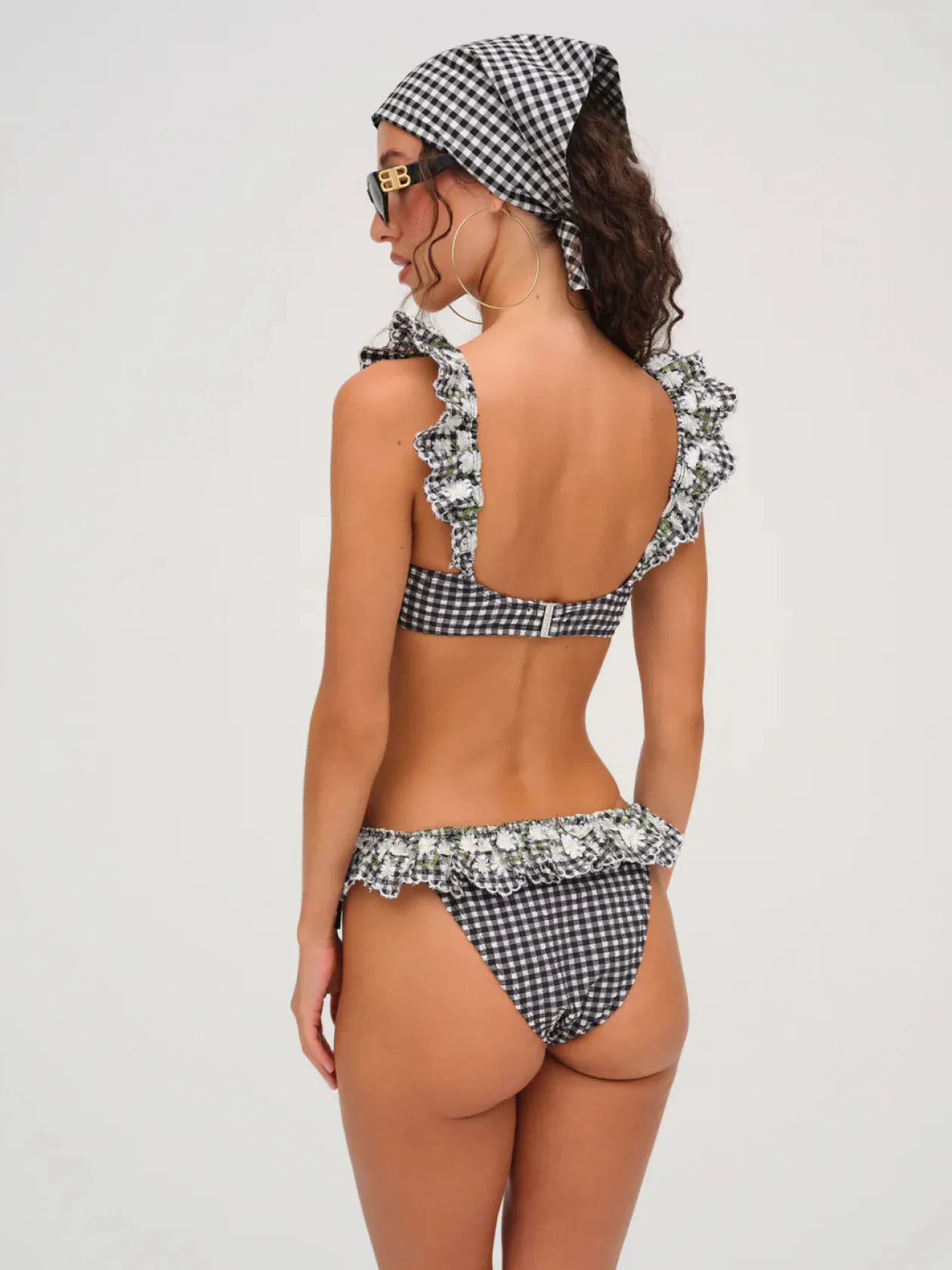 Become a retro Muse in the vintage-inspired Daisy Lane black bikini top. Crafted in a charming black and white gingham, this ruffled bikini top features a scoop neckline, ruffled lace trim, and a center-front bow. Pair it with the Daisy Lane Bikini Bottom for the full bikini set.