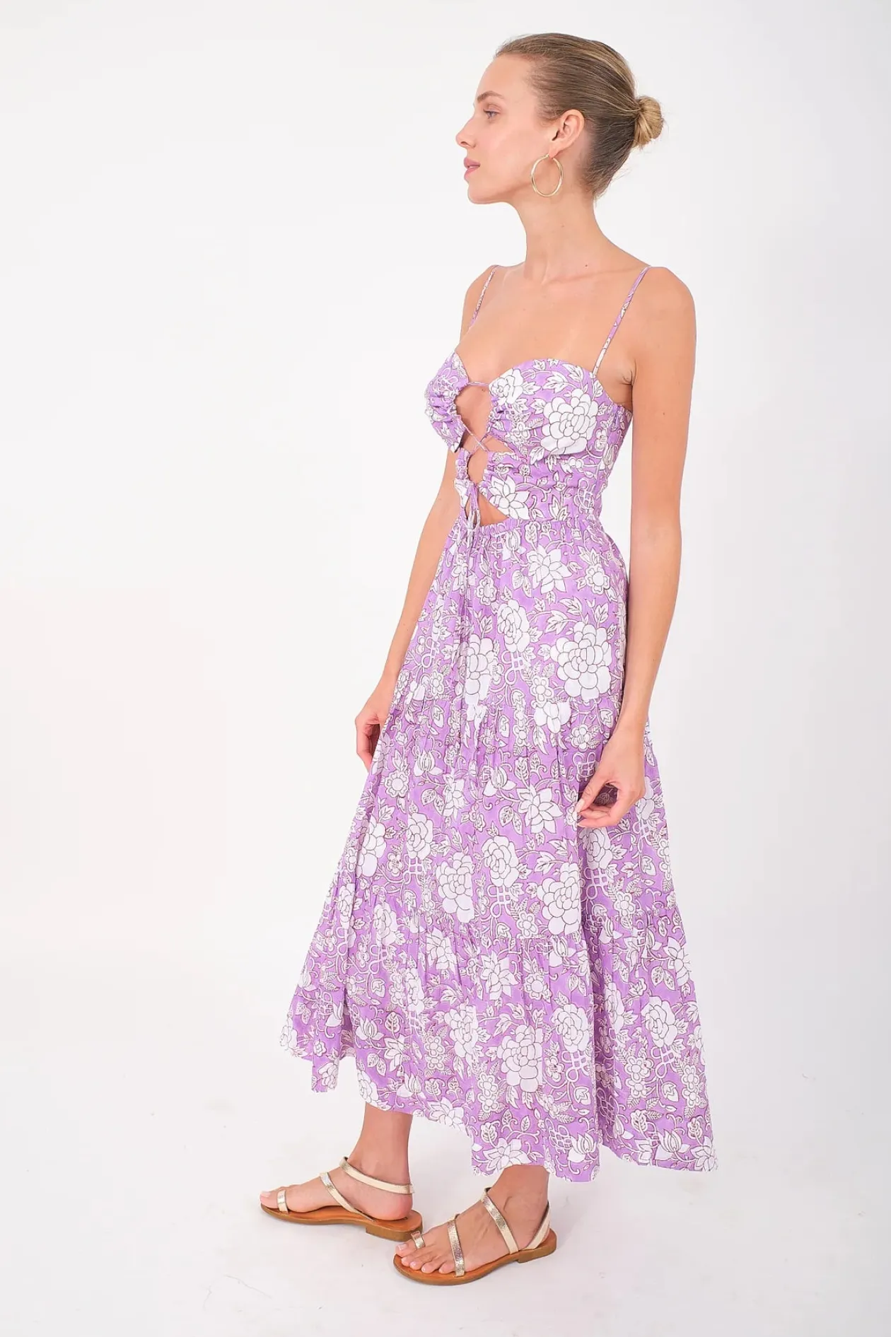 The sweetly sexy Isabella midi dress laces up at the front and has a cut out detail at the back with a low drawstring tie. Featuring adjustable rouleau straps, side pockets and a tiered midi length skirt. Hand-crafted in ultra-lightweight cotton voile.