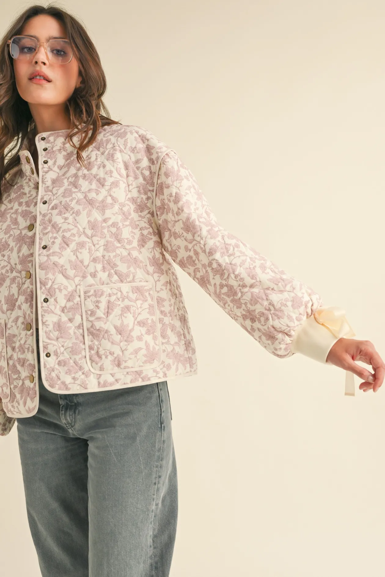 Meet the stylish Eloise Quilted Jacket, featuring a floral pattern with delicate ribbon accents, a stand collar, and a snap button closure. The contrast binding adds a touch of sophistication, while the drop shoulder long balloon sleeves and tying ribbon detail on the cuffs add feminine touch. With patch pockets and a lined interior, this jacket is fashionable and fuctional.