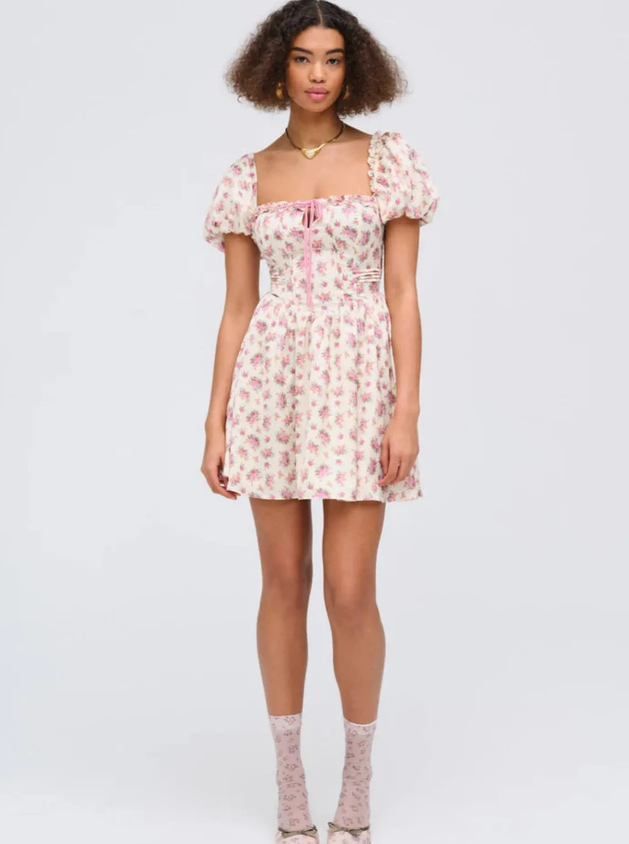 A chic mini dress for the warm days of late summer and early fall, the Etienne floral dress is rendered in a romantic pink floral print. Featuring puff sleeves with ruffles, a corset-like bodice with boning, and decorative pintucks—this satin mini dress is as flattering as it is feminine.