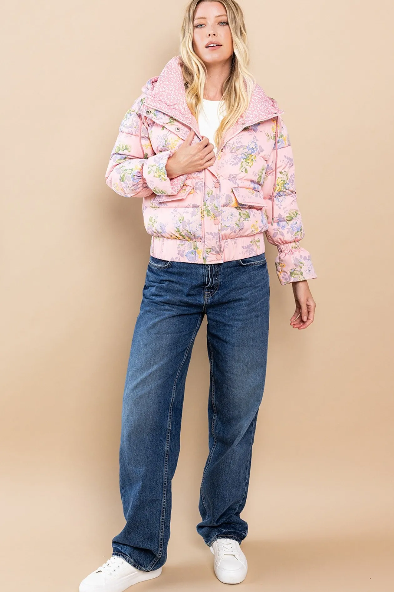 Floral printed puffer jacket with a zipper and snap button enclosure. Elastic sleeve opening and bottom hem. Hooded & lined.