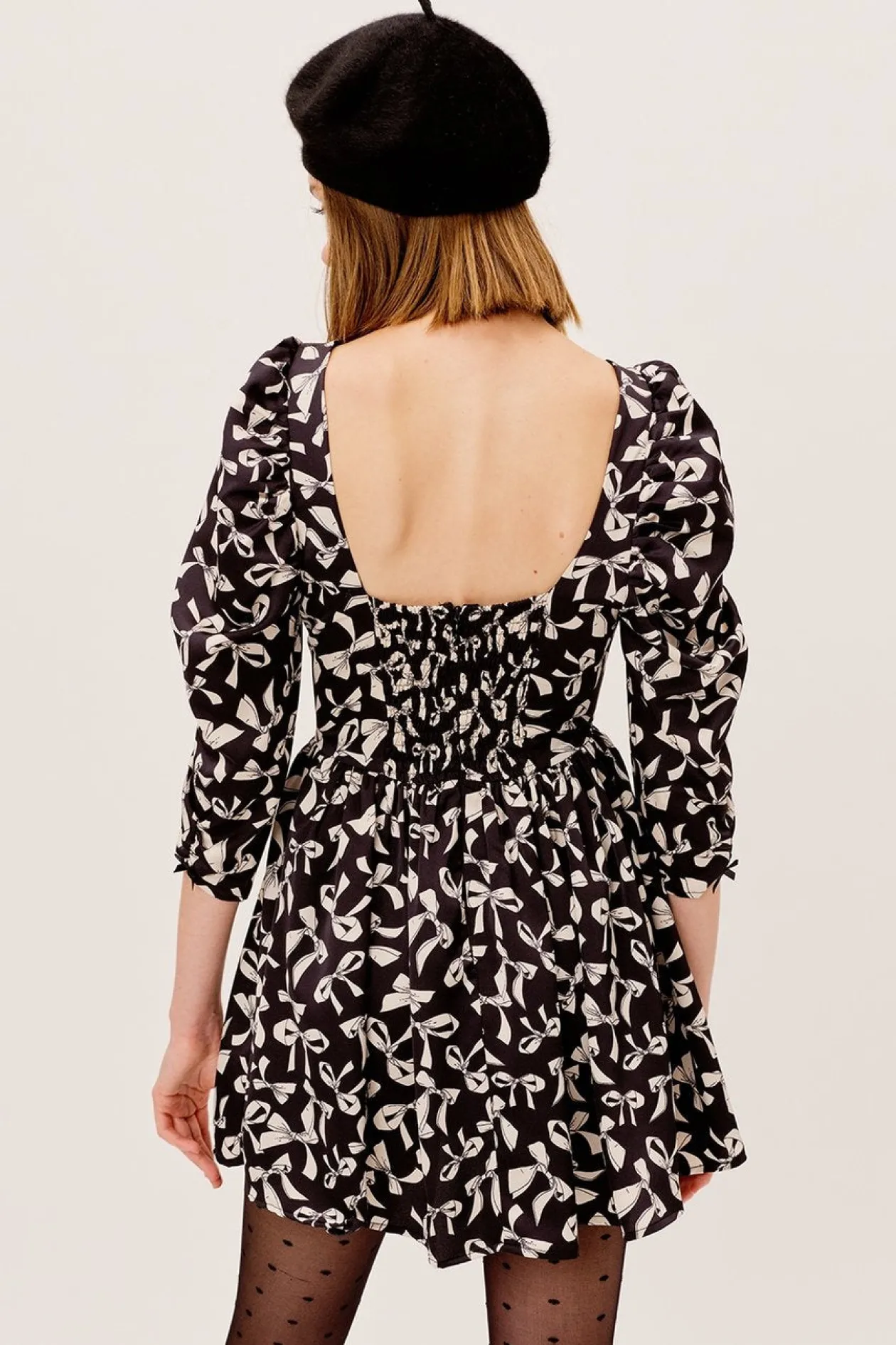 Lighthearted bow print mini dress featuring a modern square neckline, feminine shirred skirt, and pretty draped sleeves. Fitted bodice, zipper closure.