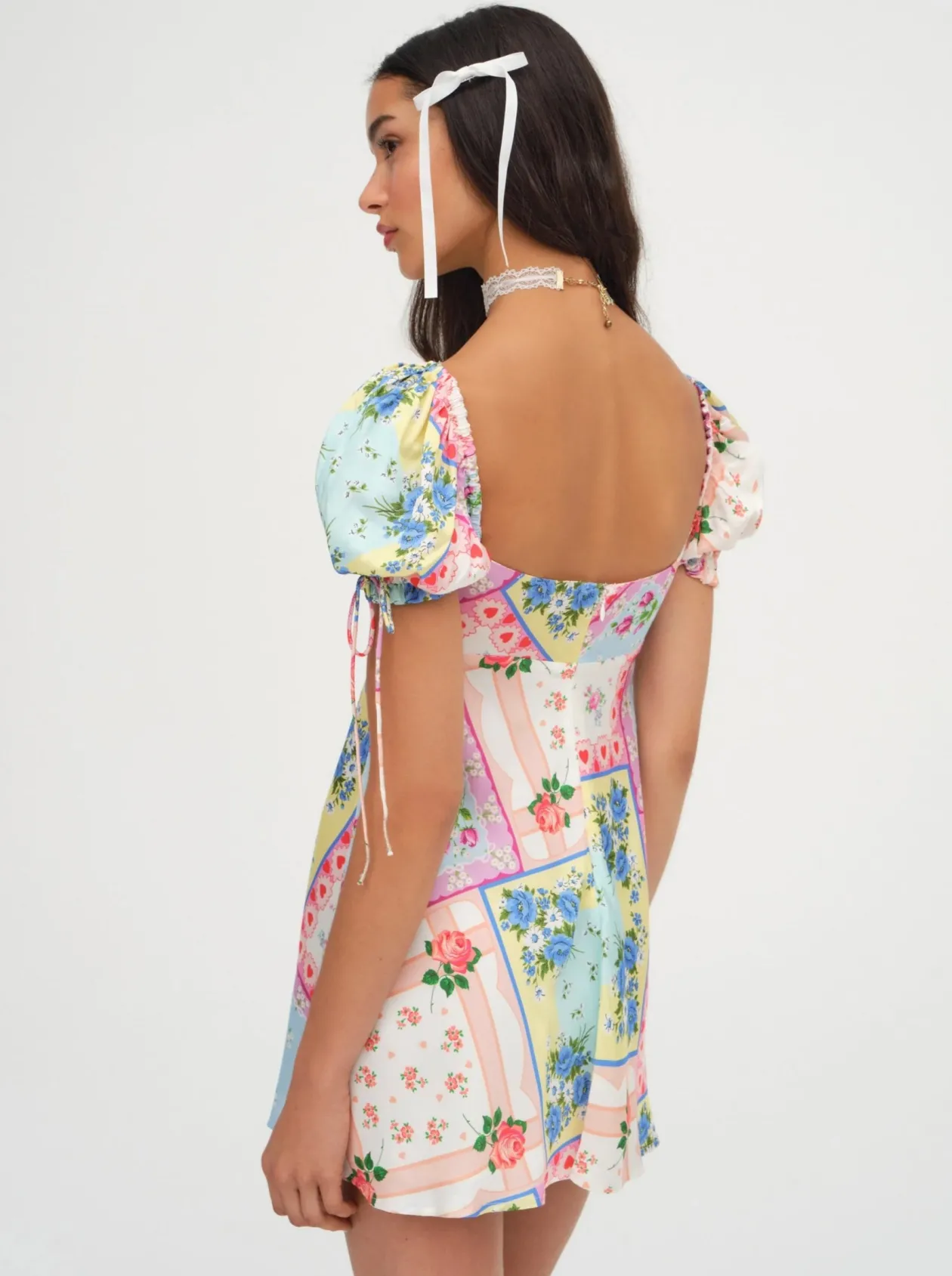 An ultra-sweet look for rain or shine—the Cassandra blue mini dress brings the charm factor with its vintage handkerchief-inspired print and alluring puff sleeves. With its crochet rosette at the neckline, this patchwork dress brings the spirit of the ’70s, making it the perfect choice for festivals this spring.