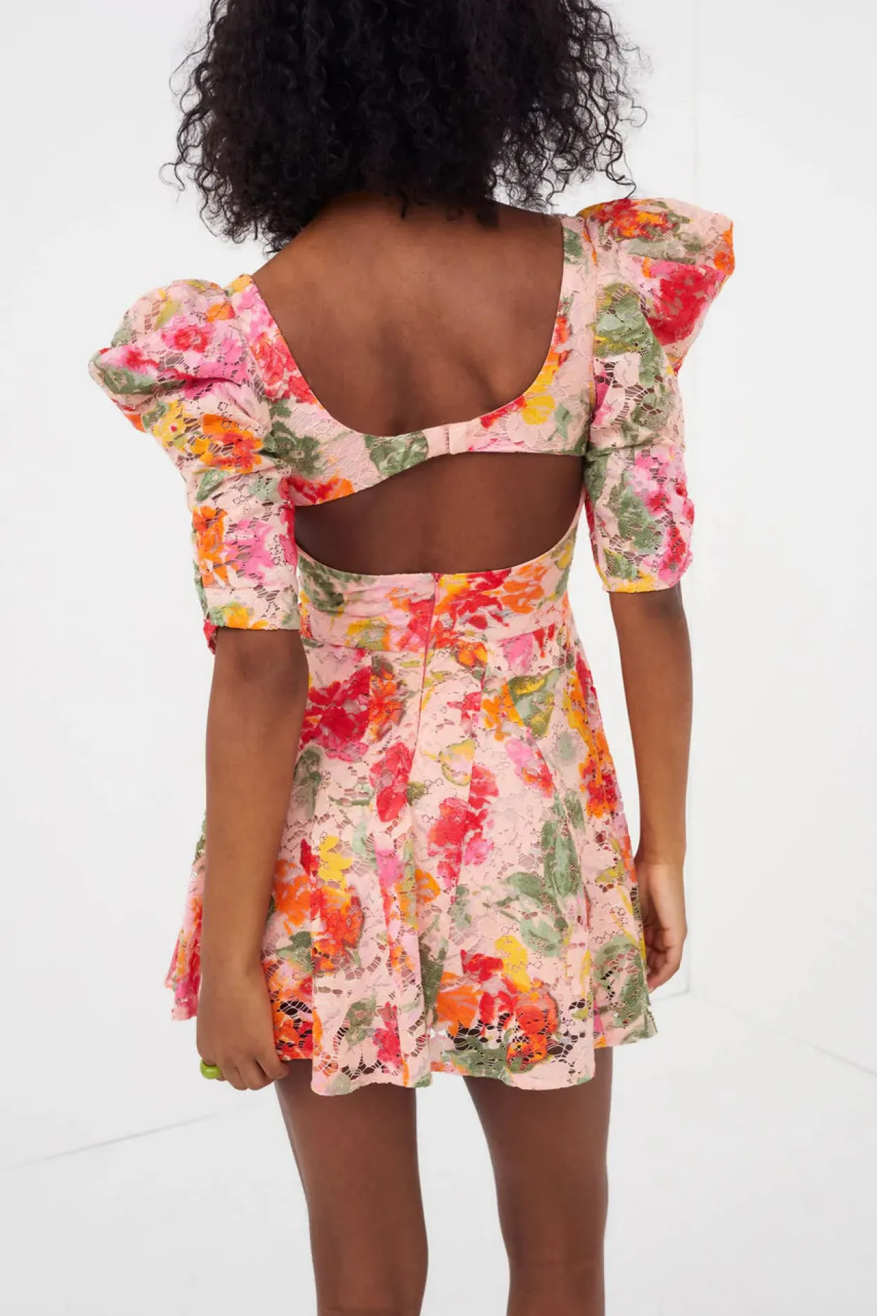Faint floral lace mini dress with exaggerated elbow-length puff sleeves and gore paneled skirt. Keyhole along scoop back with center-back invisible zipper.