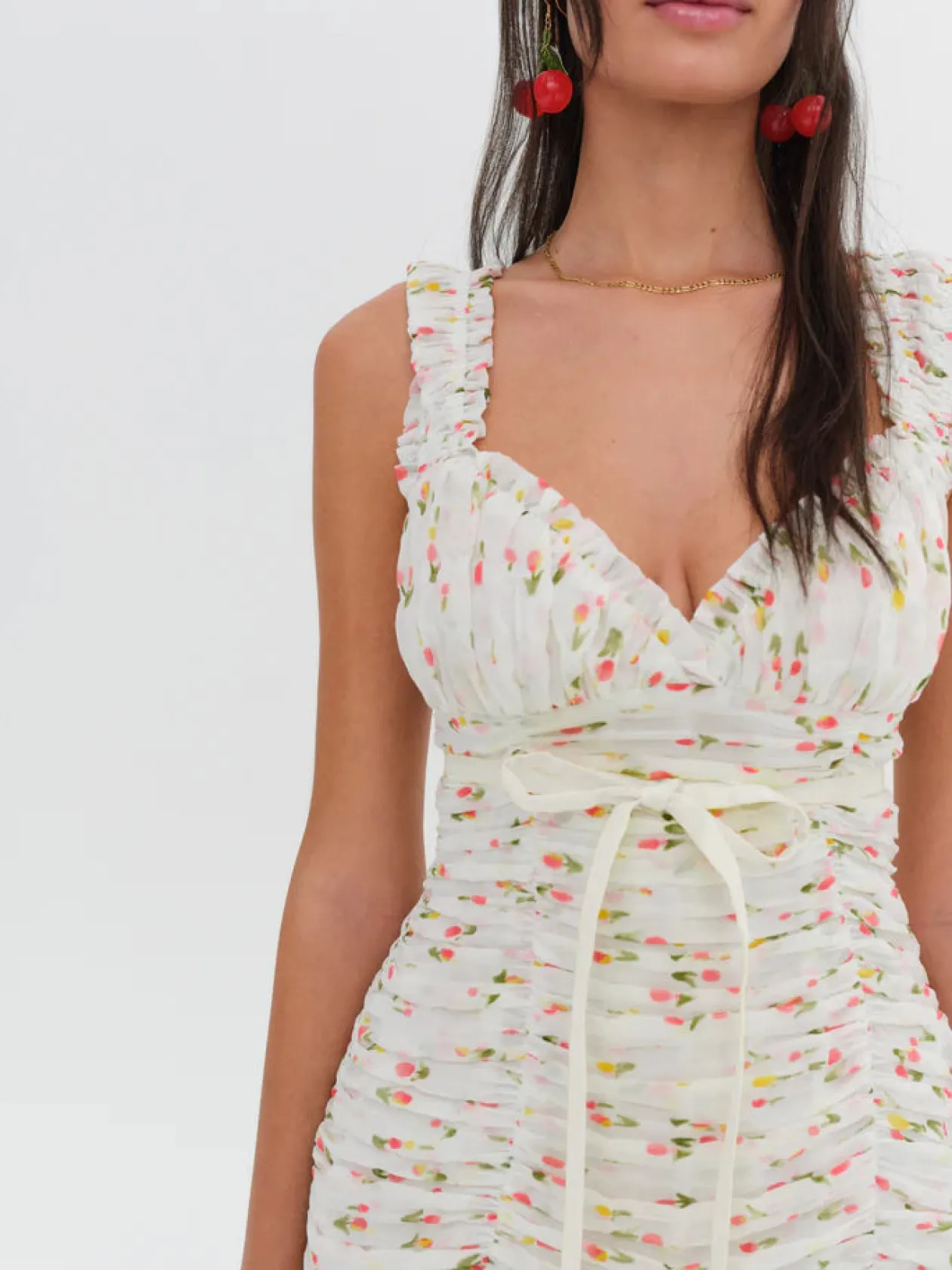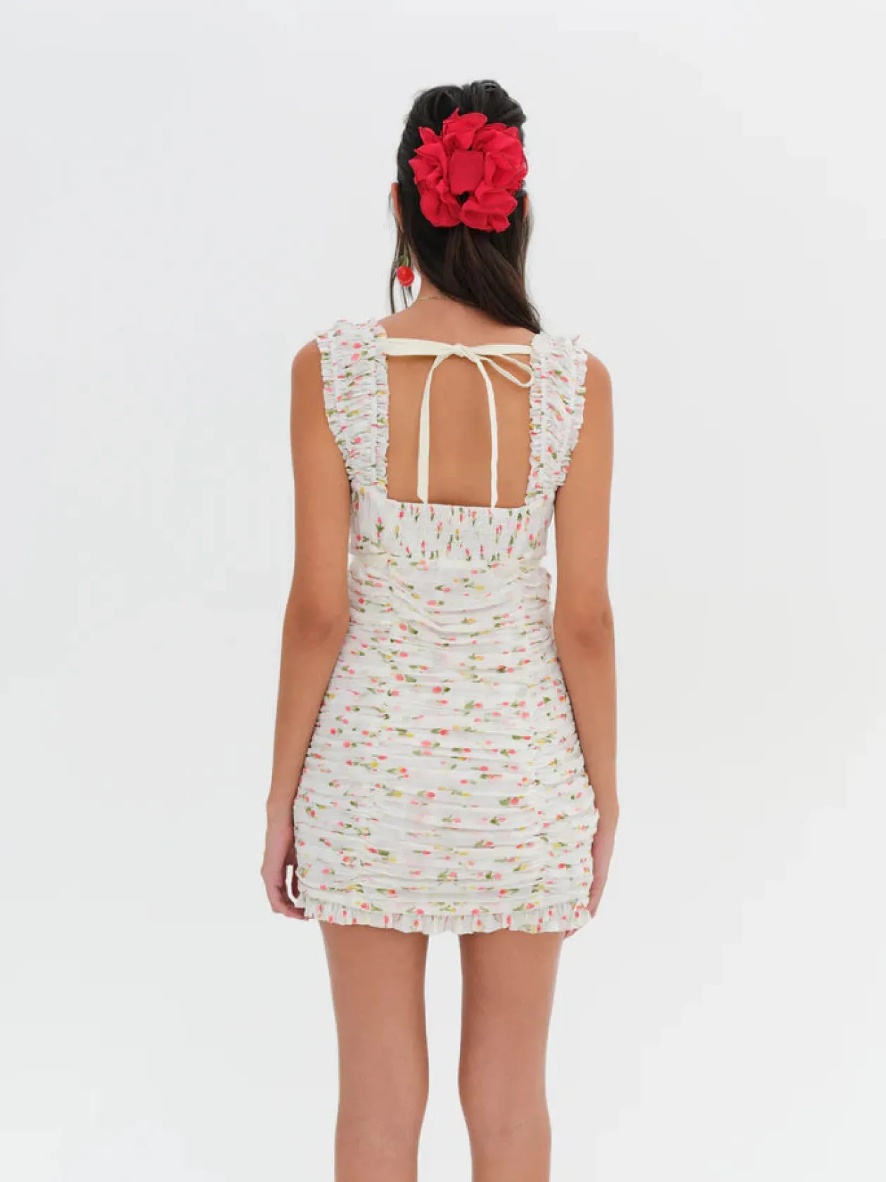 Daydream away in the Elodie yellow mini dress, a charming style with an allover gathered tulip print. This puff sleeve dress features a sweetheart neckline and ruching across the busy and body which is complemented by ruffles on the neckline and hem.