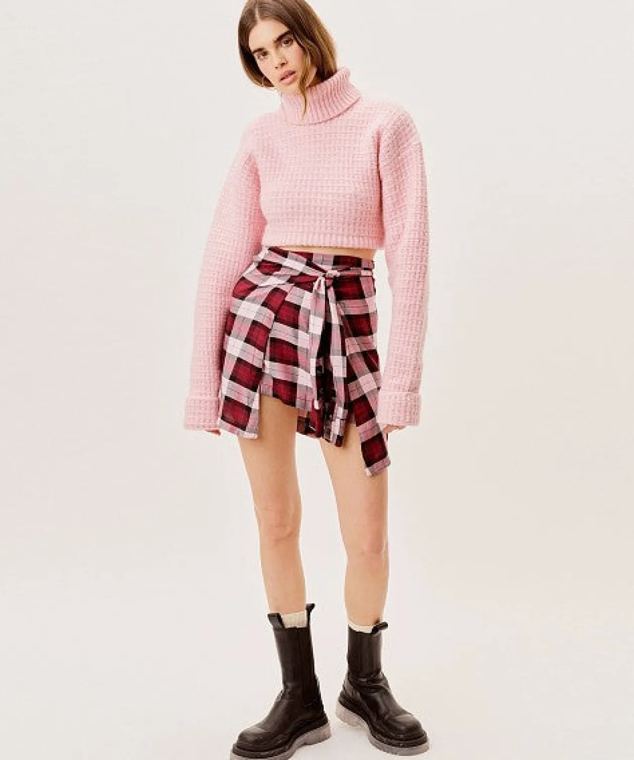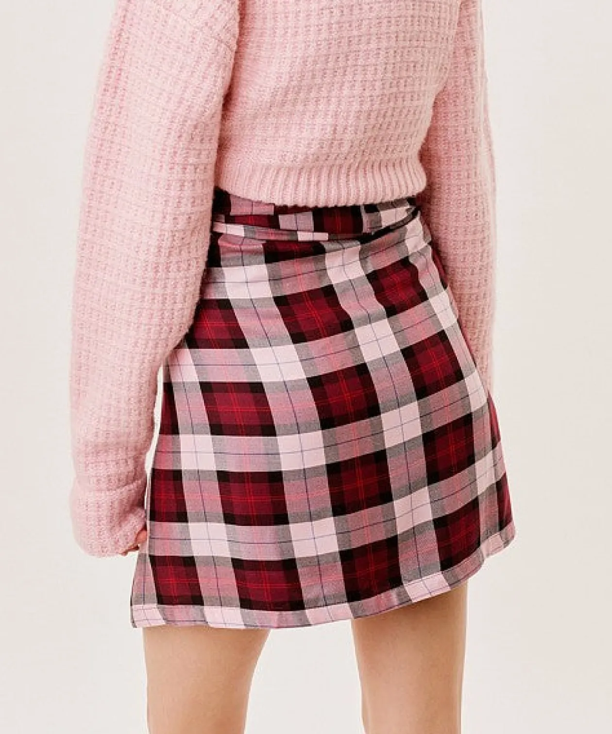 90s-inspired plaid wrap mini skirt featuring a faux flannel tie waist and decorative buttons alone front tie. Unlined.
