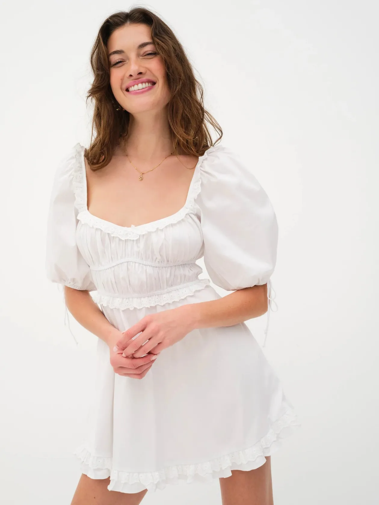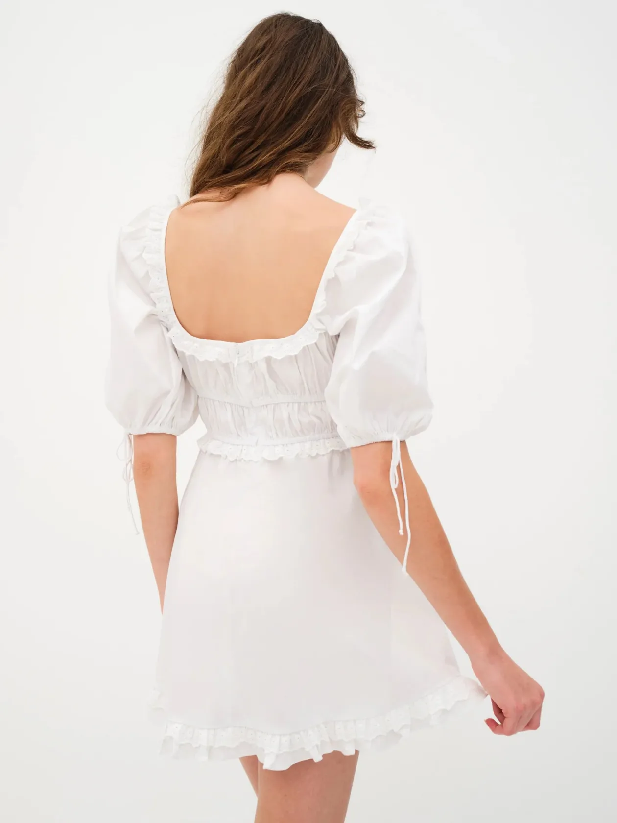 Vintage-inspired cotton poplin mini dress featuring delicate ruffled eyelet trim throughout. Shirred bodice, puff sleeves, and side seam hidden pockets. Fit-and-flare silhouette.