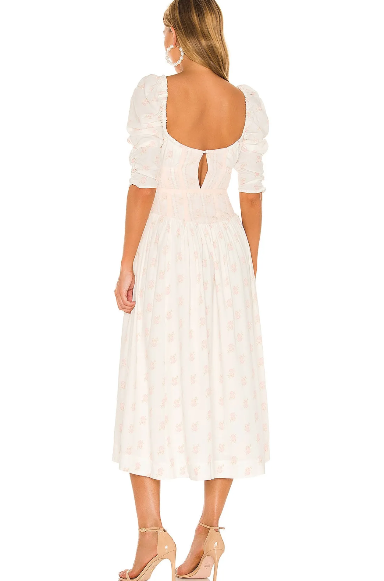 - Puff shoulders with elastic shoulder trim and ruched cuffs