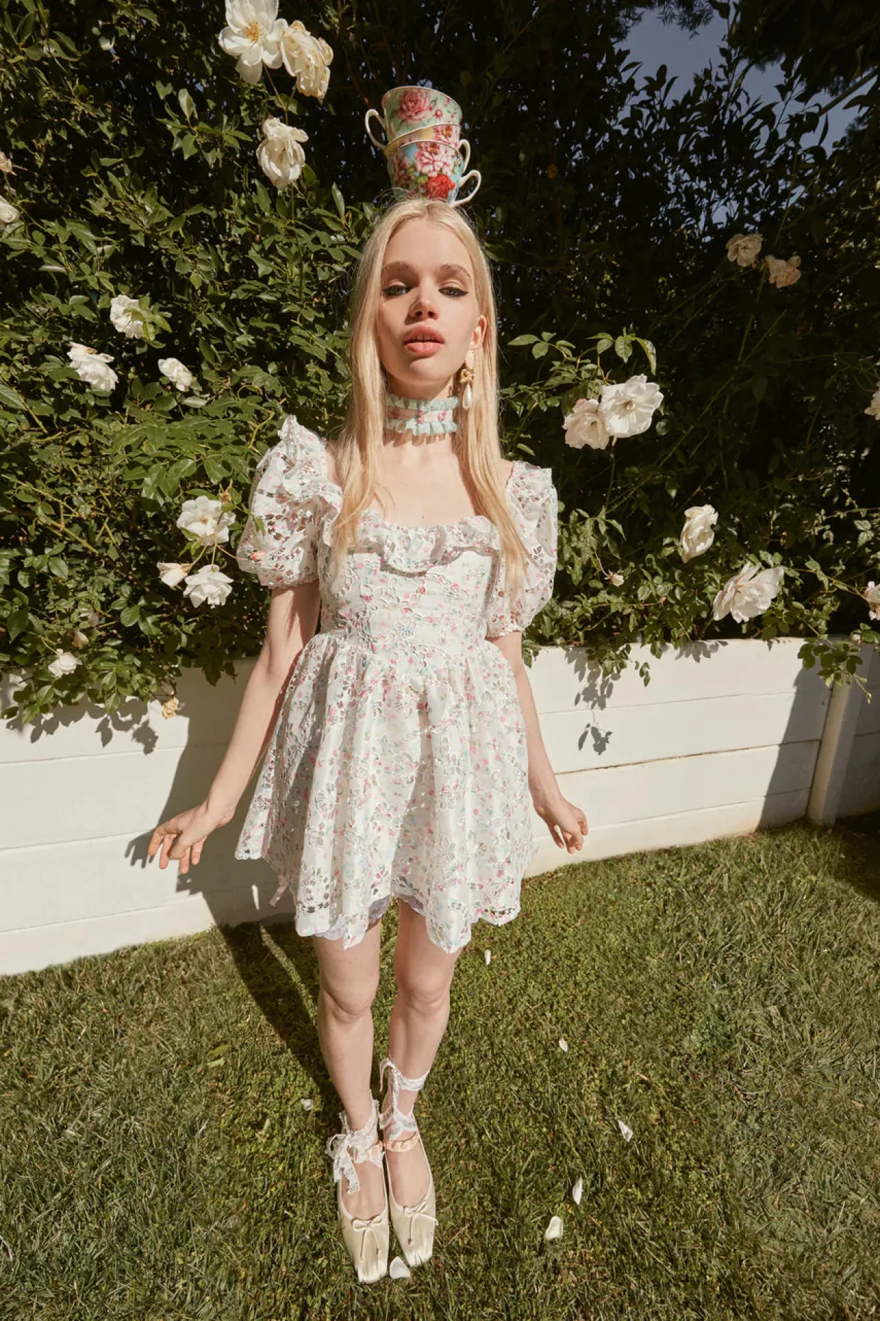 Laser-cut, printed taffeta has a unique, lacy look on this mini style. Complete with a wide scoop neckline with ruffle, puff sleeves, and a full, gathered skirt.