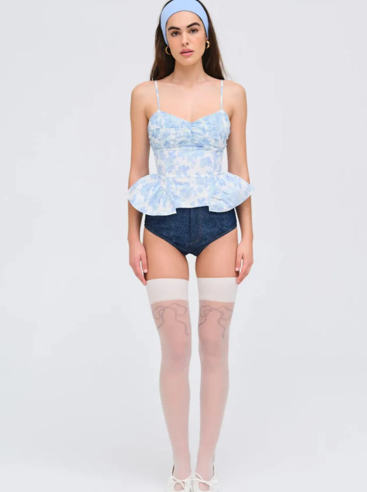Crafted in 100% cotton poplin, the Oliver blue top cuts a romantic aesthetic with its a vintage-inspired rose print. Featuring a ruched bust panel, hip ruffles, and chiffon ties, this sleeveless top has boning at the princess seams for a waist-cinching finish.