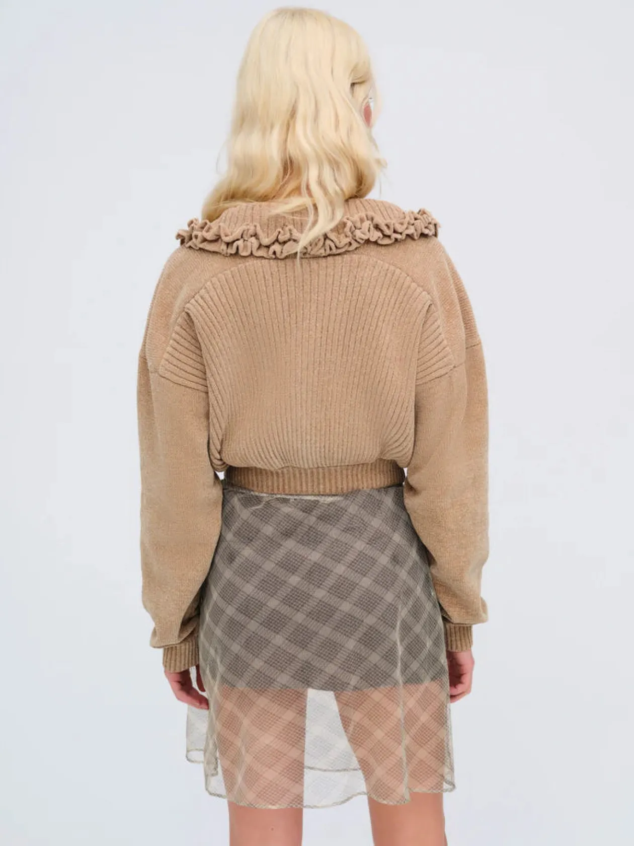 An ultra-cozy style for fall days, the Rey Knit Jacket in tan exudes a sense of everyday romance. Crafted in a soft chenille rib, this chunky cardigan is cut to a cropped length with casual dropped shoulders and knit ruffles at the collar.