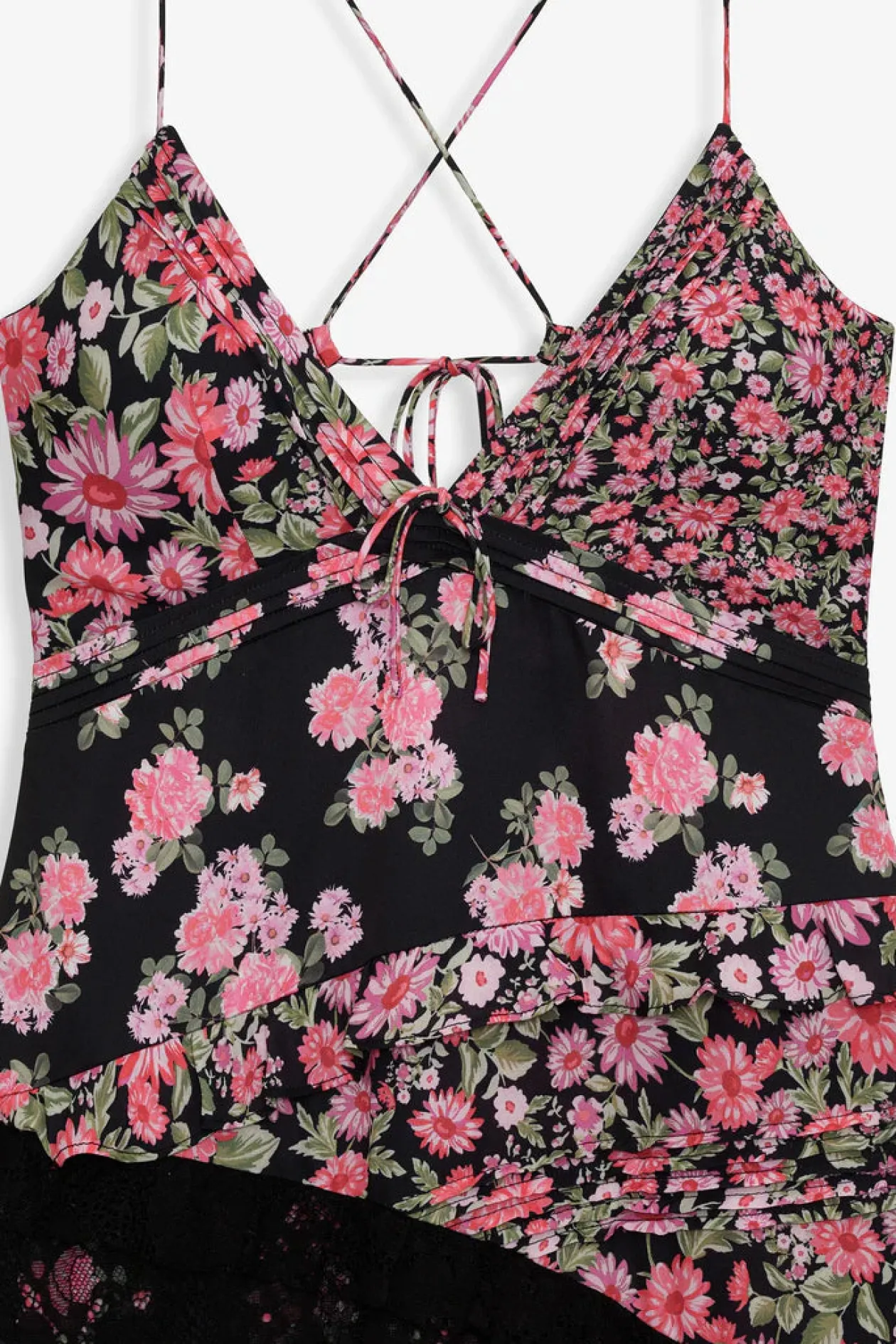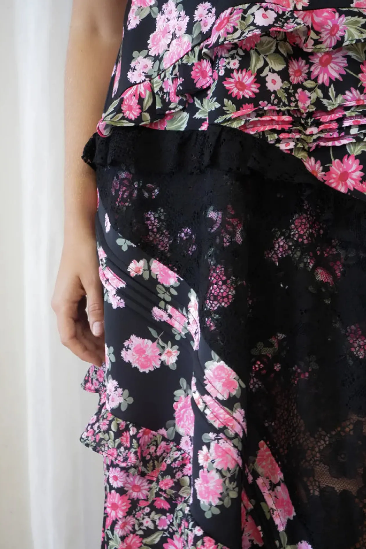 Our bestselling maxi dress silhouette is back in black and pink floral print. Inspired by ’70s dresses, the Rosalyn patchwork dress has a plunging neckline and features mixed print paneling and floral lace with ruffle details throughout.
