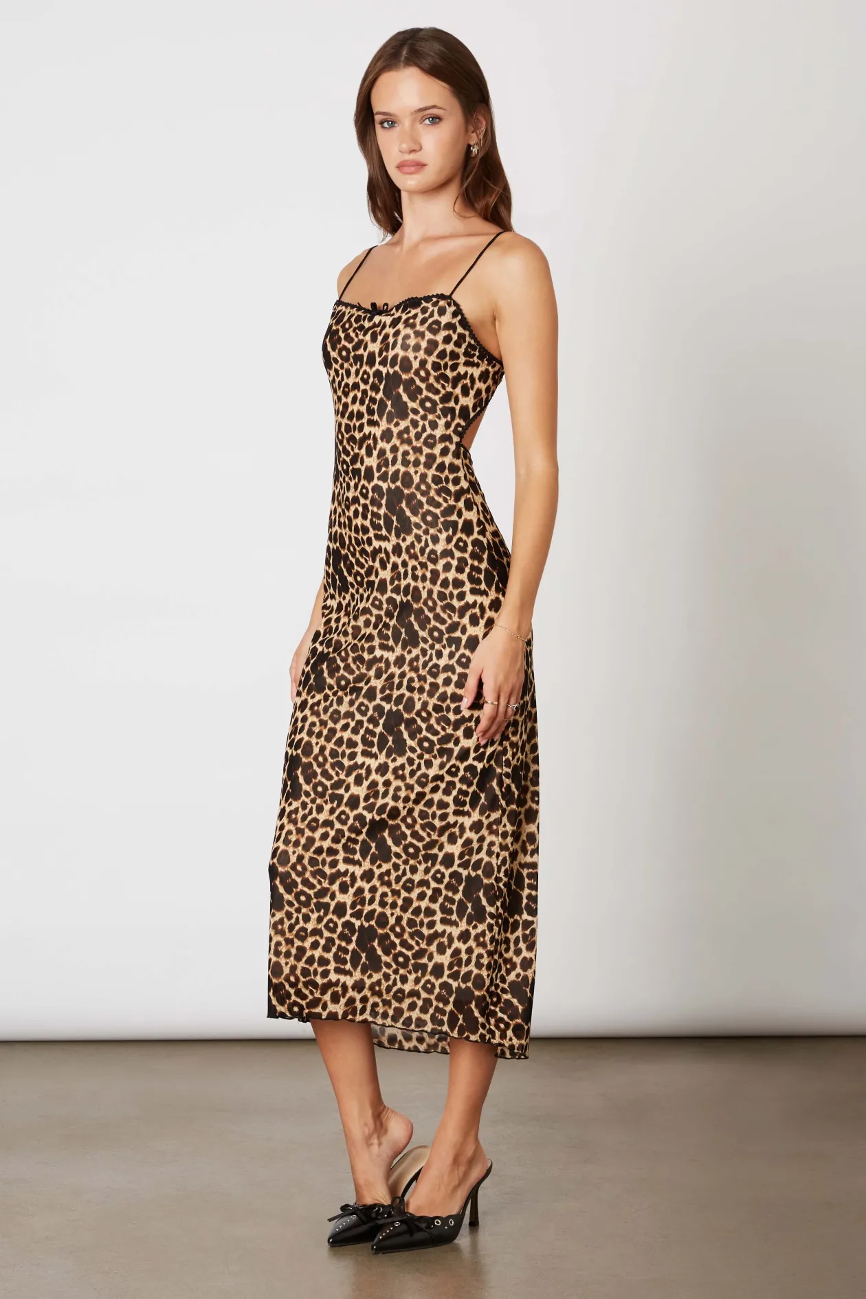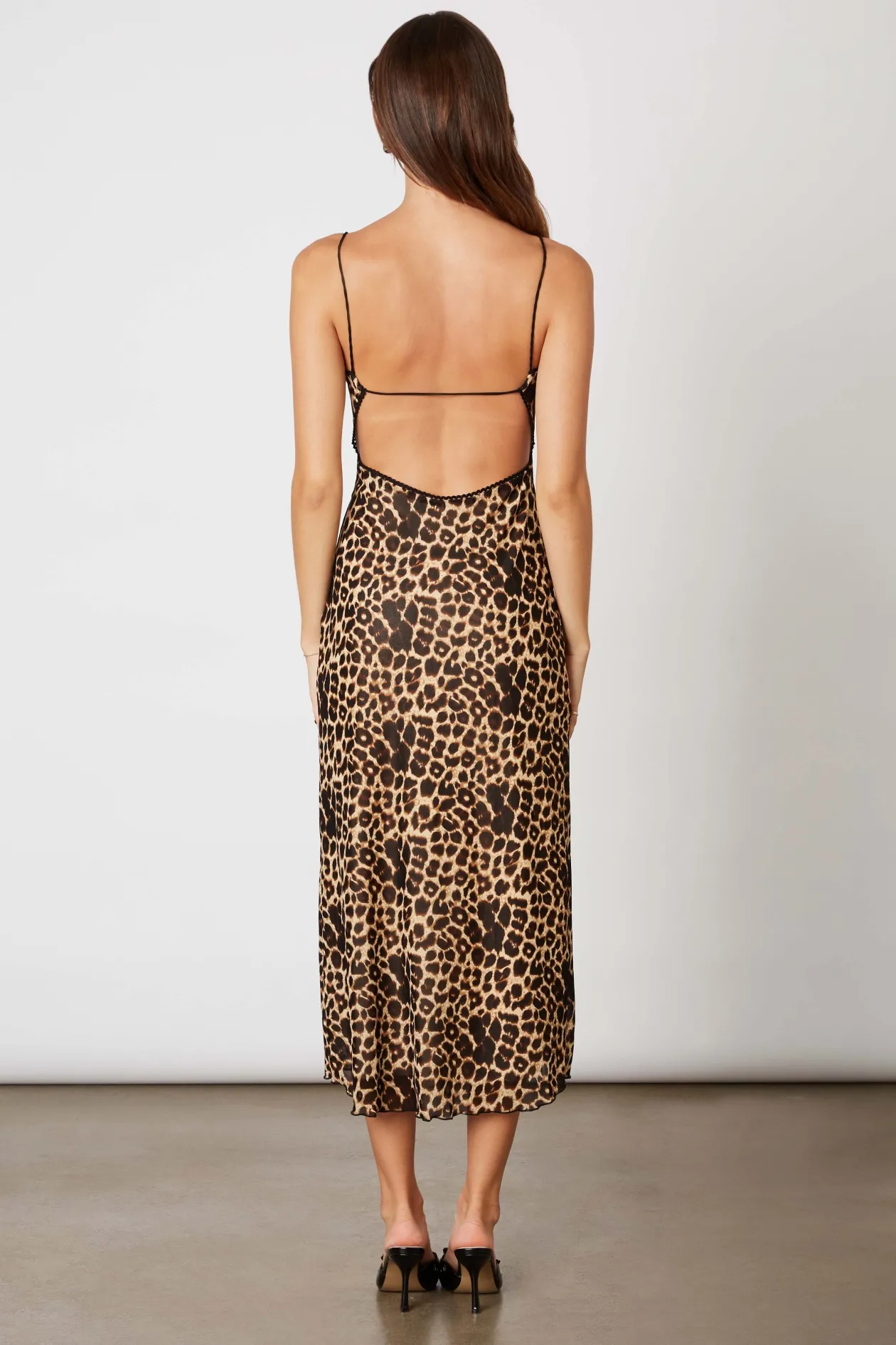 Leopard print midi dress with a back cut-out, body-con fit and stretch.