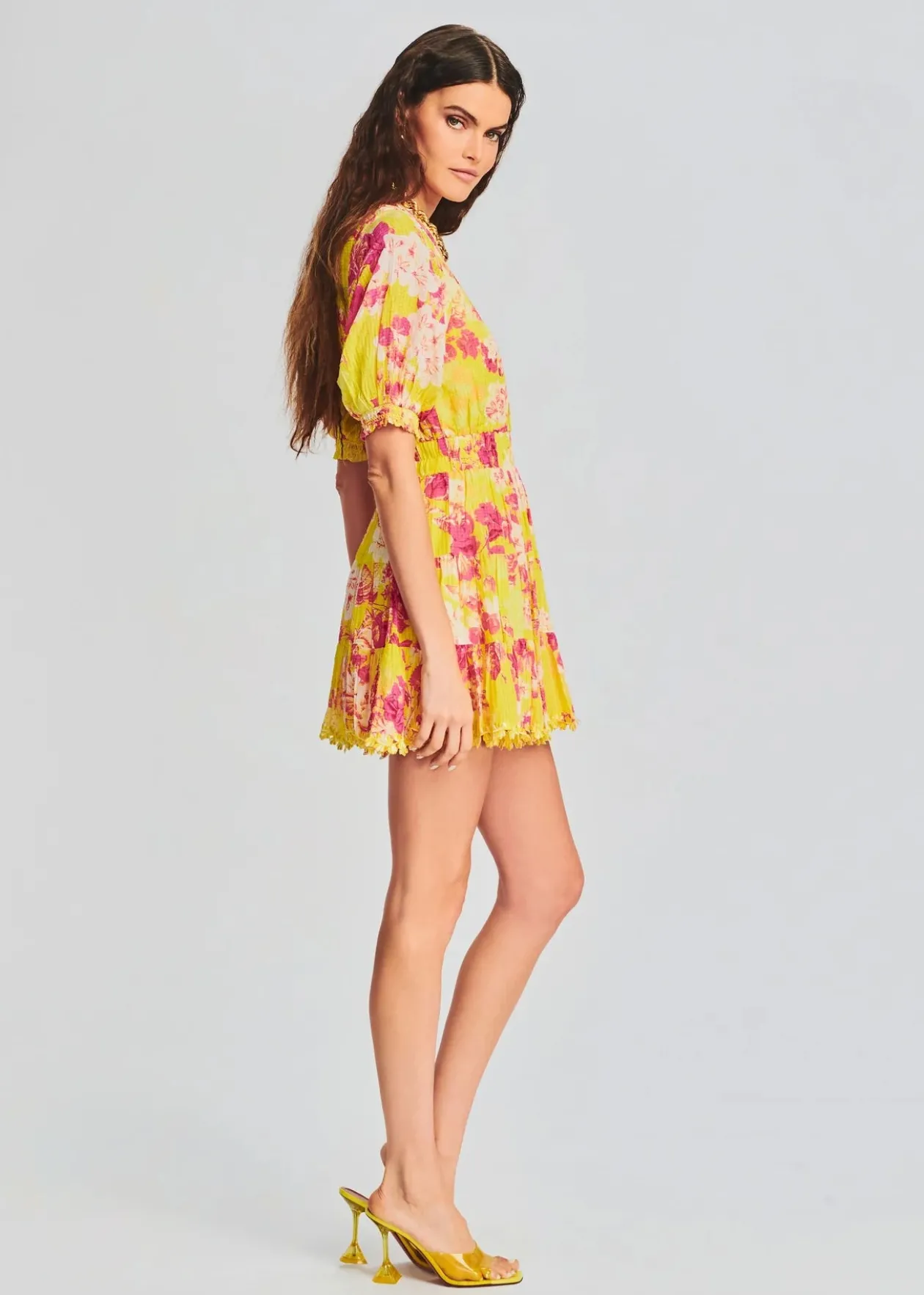 The Auril Dress is a bright and playful short-sleeve mini dress. It features puff sleeves, a shirred waist, tiered skirt, and lace trim at the hem. Shown here in Yellow.