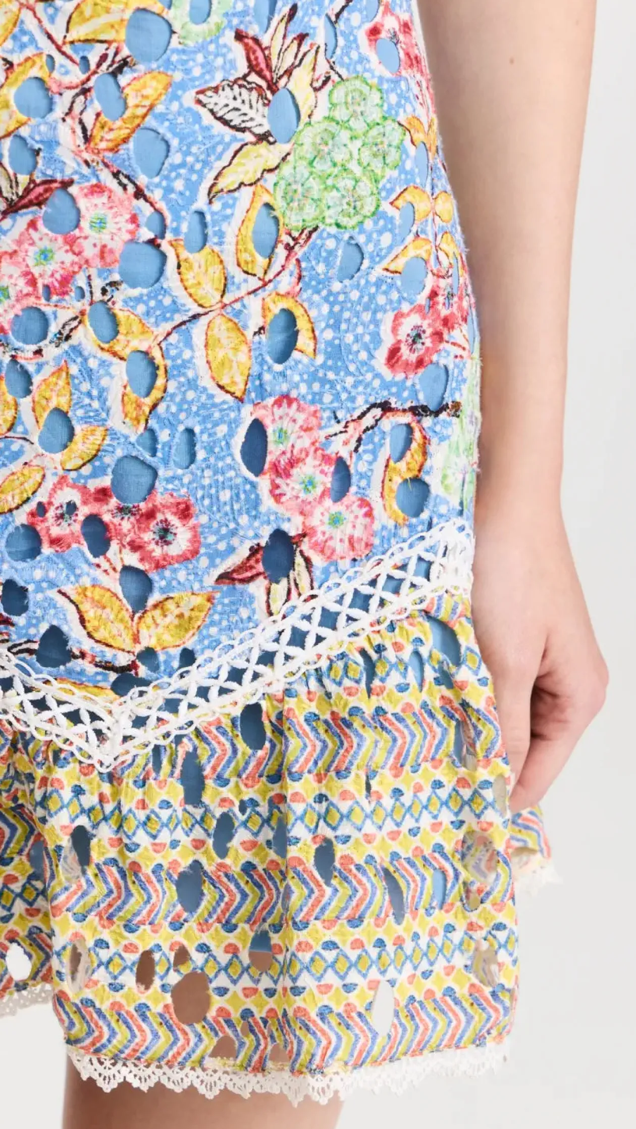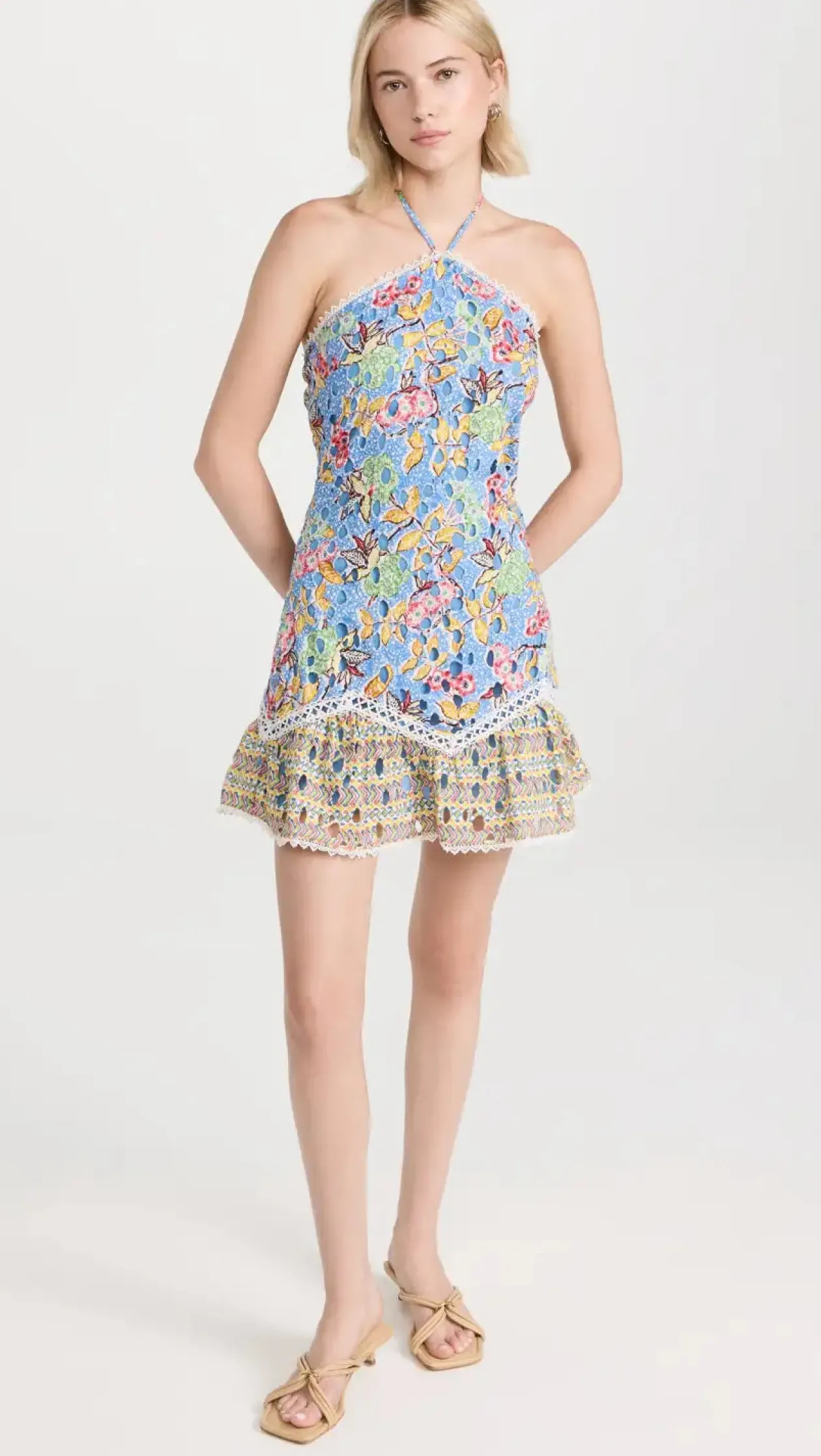 Showcase your style in Hemant & Nandita’s Preet Mini Dress. This halter-style piece features a multicolored bodice with a contrasted lace trim mermaid-style mini skirt. Shown here in Blue.