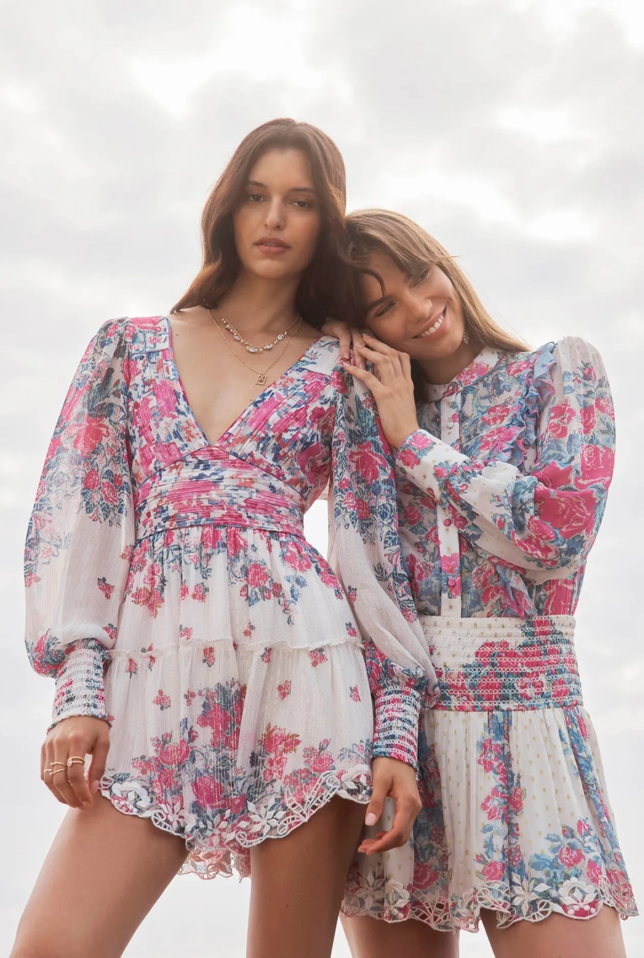 - White ruffle skirt with a floral print in shades of pink, purple, lilac