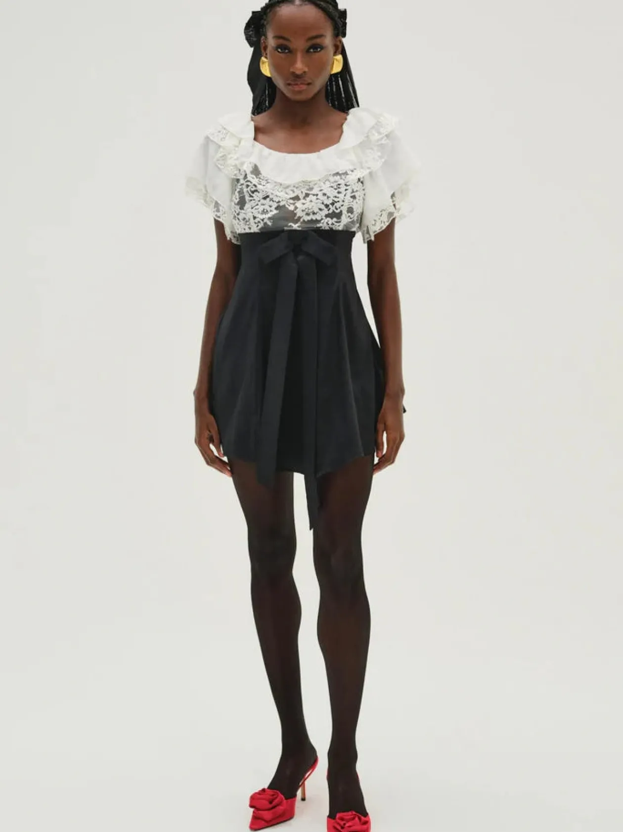 Indulge in the joy of the holidays with the Holiday black and white lace mini dress—a piece that transitions from dinner dress to party dress with stylish ease. Featuring a sheer lace bodice over taffeta cups and a full gathered skirt, this little black dress is decorated with tiered chiffon and lace ruffles and a fixed taffeta bow at the waist.