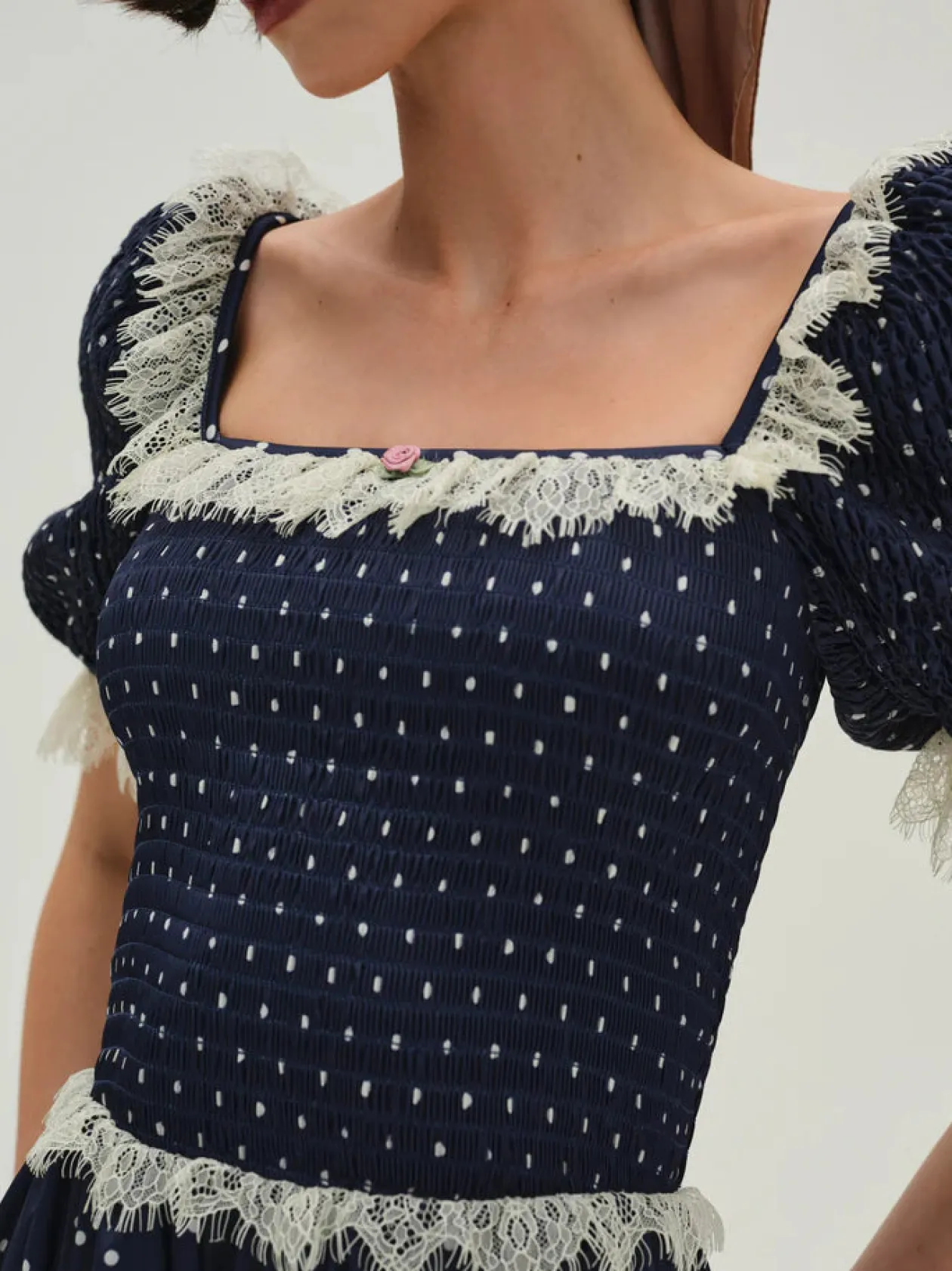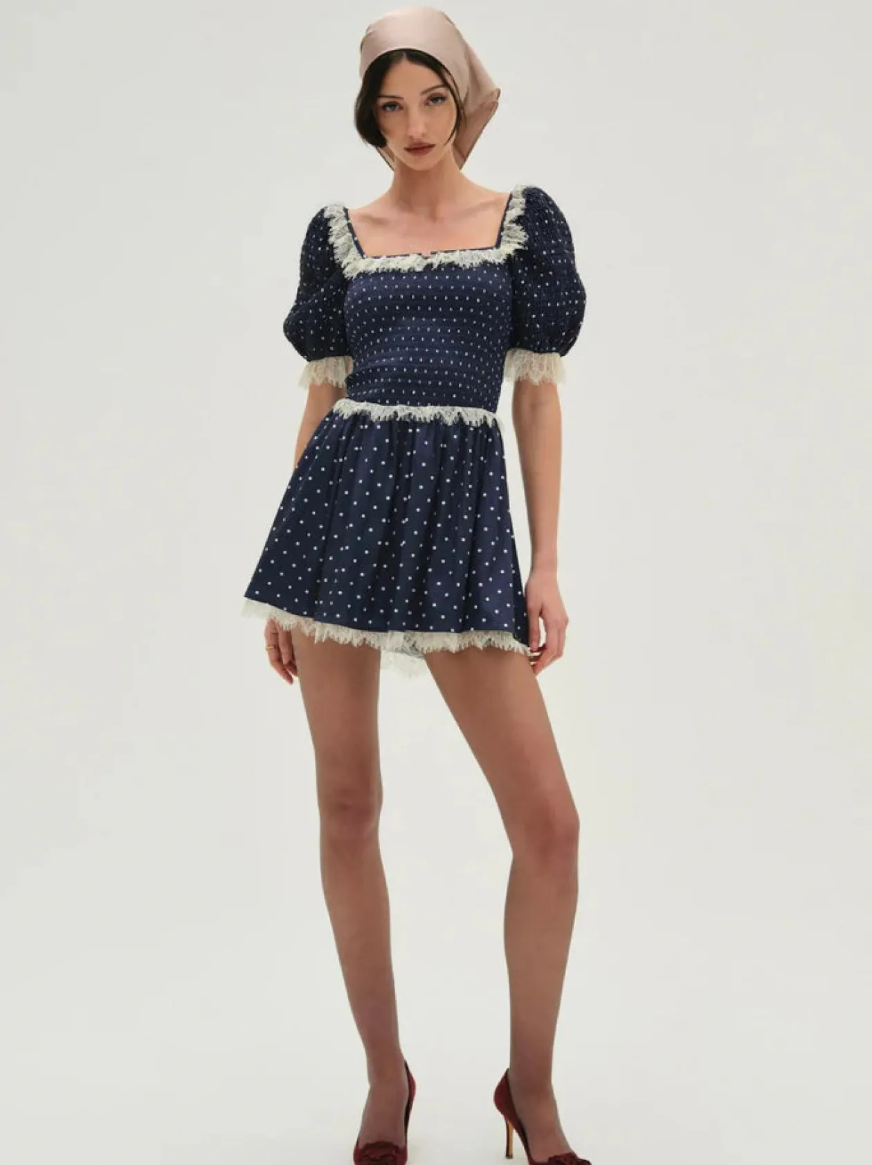 The Inès blue mini dress exudes an irresistible charm. Crafted in a polka-dot printed satin, this puff sleeve mini dress spotlights smocking at the bodice, ruffled lace trims, and a rosette at the center-front.