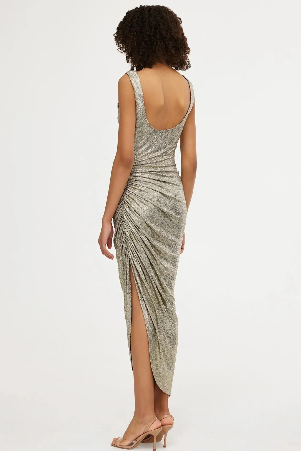 The Jemima Midi Dress in Gold is a form fitting silhouette. Crafted from a foil print knit fabrication, this piece is complimented with a cowl neckline, gathers through the body and accentuated side split. A great option for events this season ~ pair with a simple heel for a complete look.