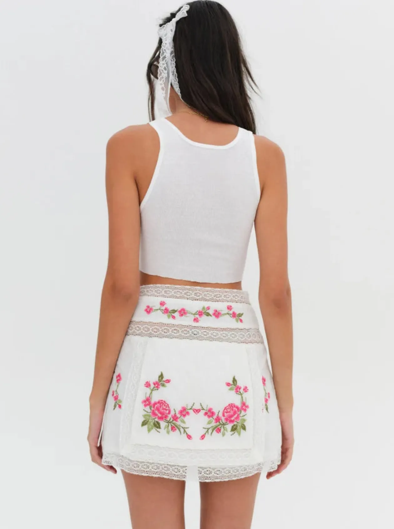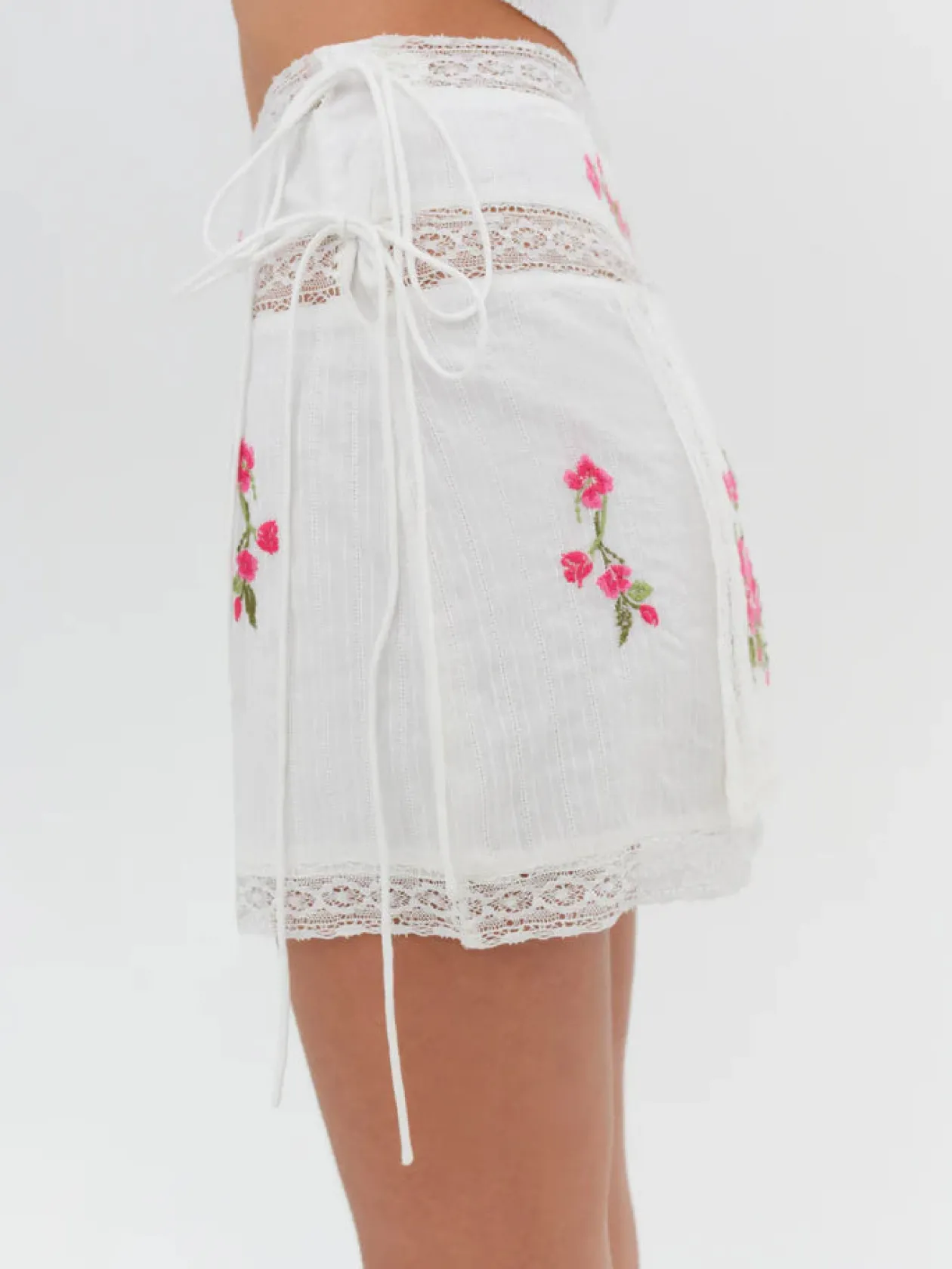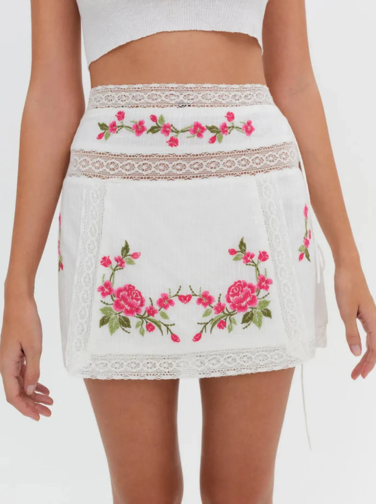 For a busy vacation itinerary, the Jolene mini skirt has chic, everyday appeal. Featuring beautiful pink floral embroidery and lace trims, this white cotton mini skirt can be styled as a co-ord skirt set when paired with the Jolene Embroidered Top.