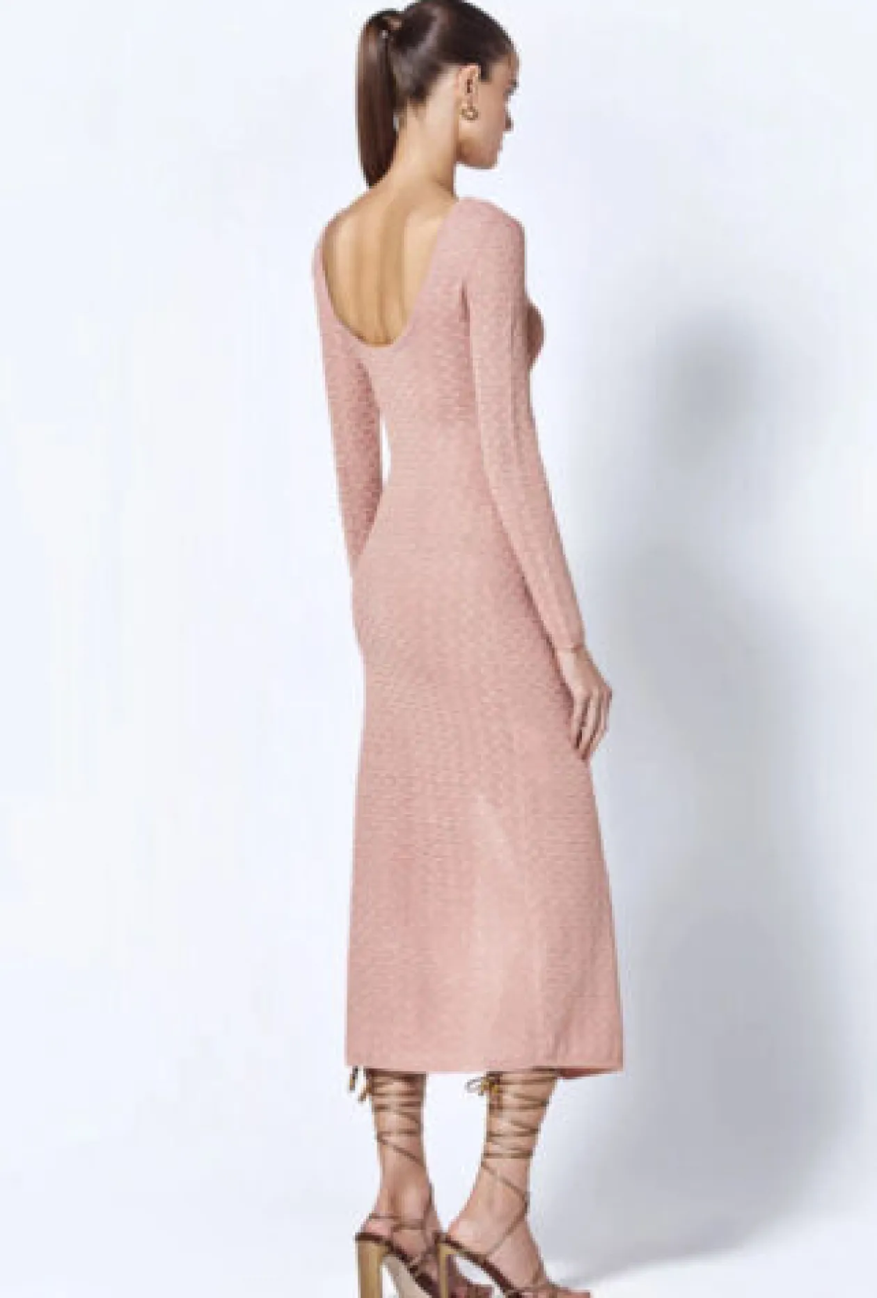 Cut in a shimmer knit, the Juliane dress features a body-skimming shape, long sleeves, a thigh-high slit, and a scoop neckline. This easy pullover maxi can be styled day to night.