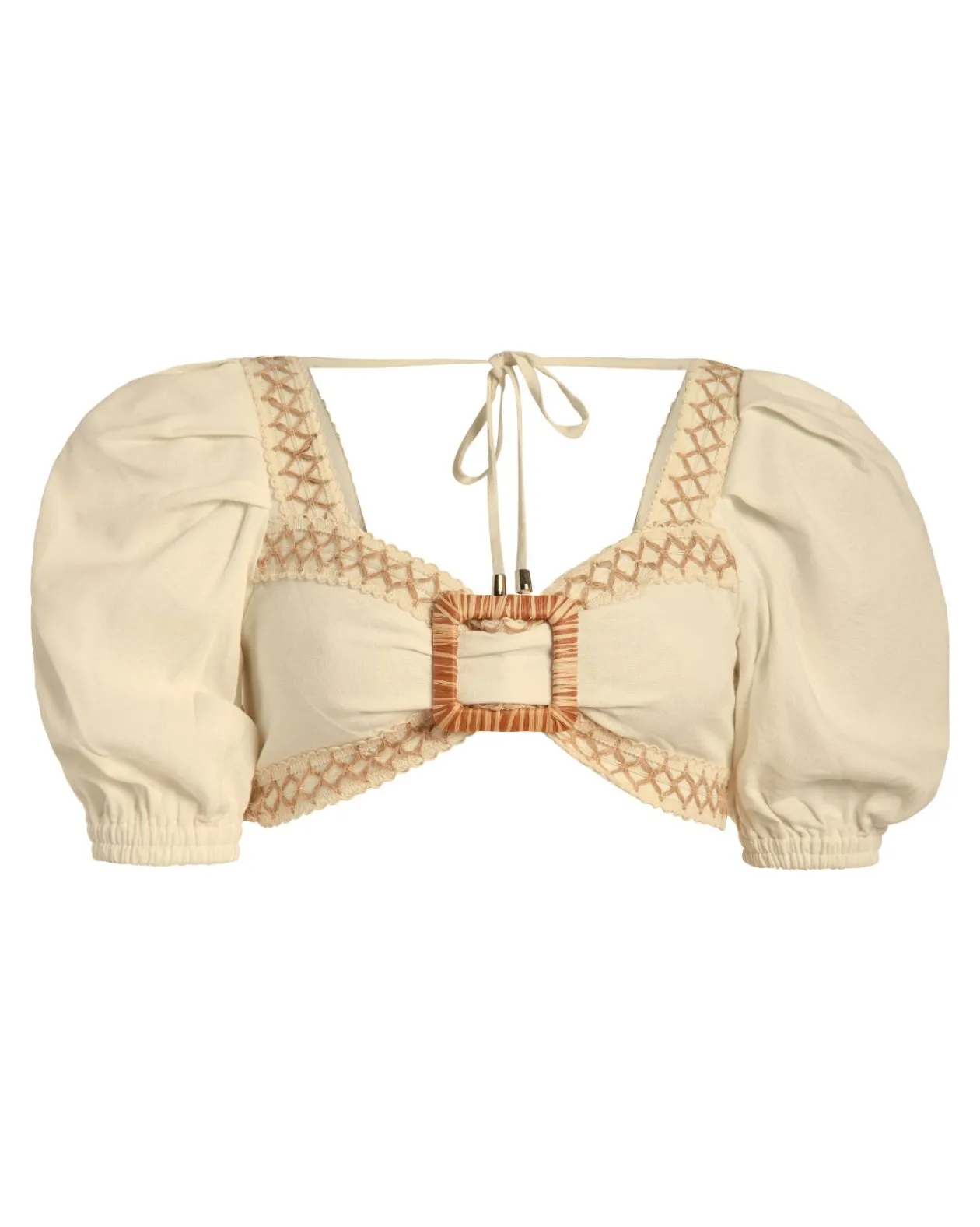 This structured cropped top features a sweetheart neckline with buckle. Short, voluminous puff sleeves. Exposed back zipper and back tie straps. Runs true to size. Larger chest sizes may want to take the next size up. Model is wearing a size 4.