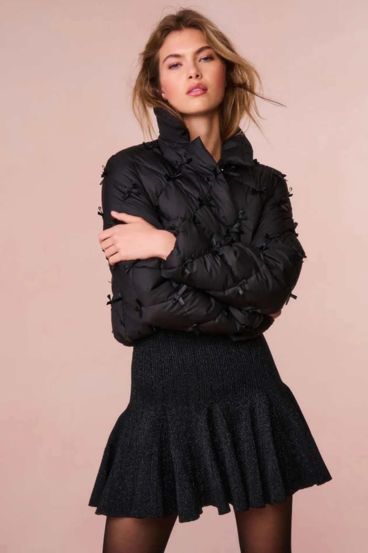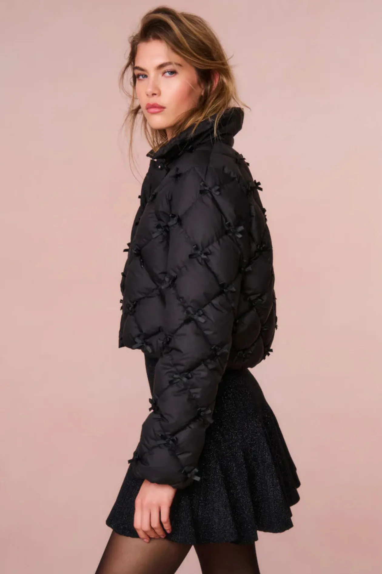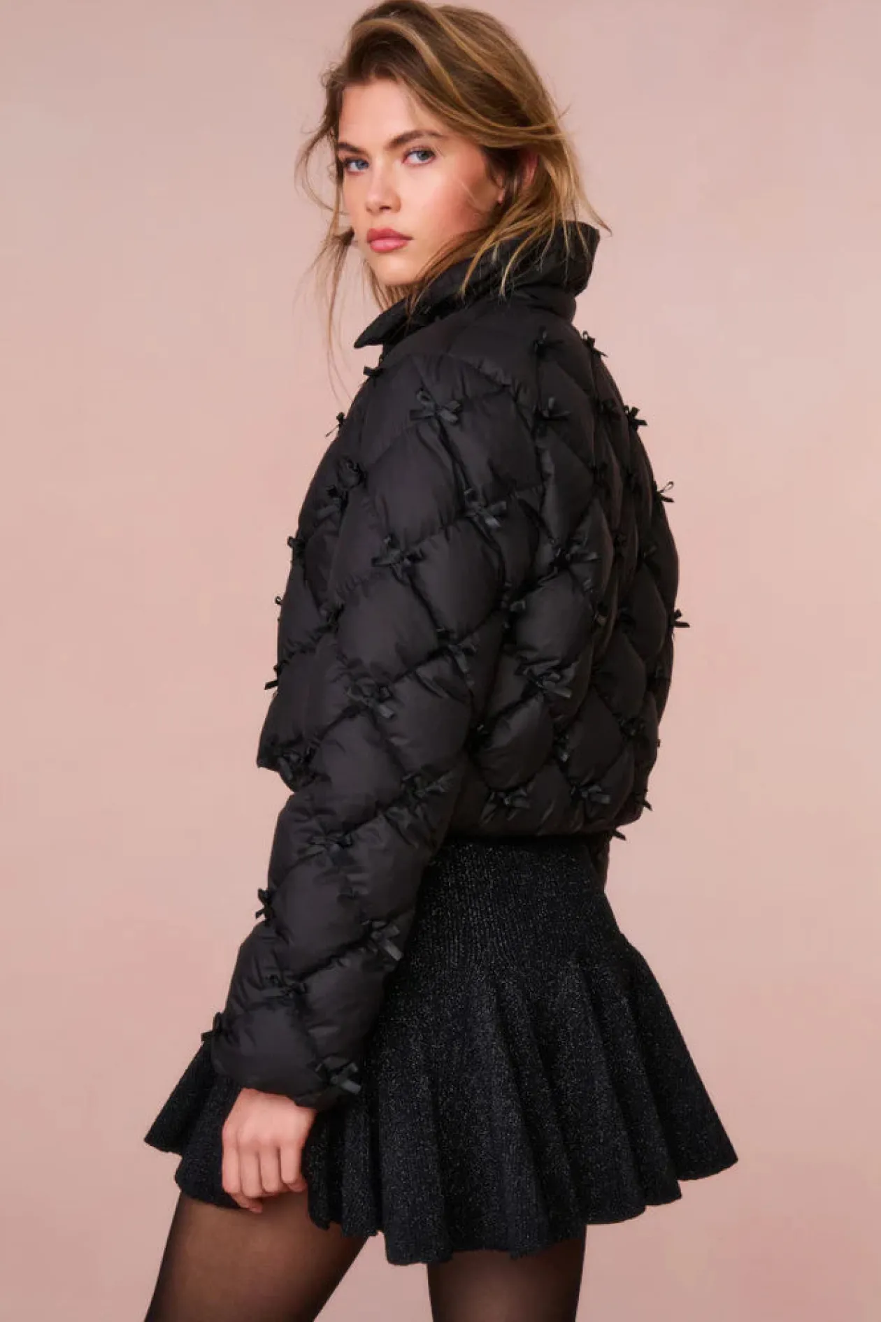 It is a bow puffer, because everything’s better with a bow. Introducing the Kasey Jacket. This quilted outerwear features top-applied bows all over for a feminine and LoveShack take on a winter staple. The warm piece is filled with down making it extra cozy and comfortable.