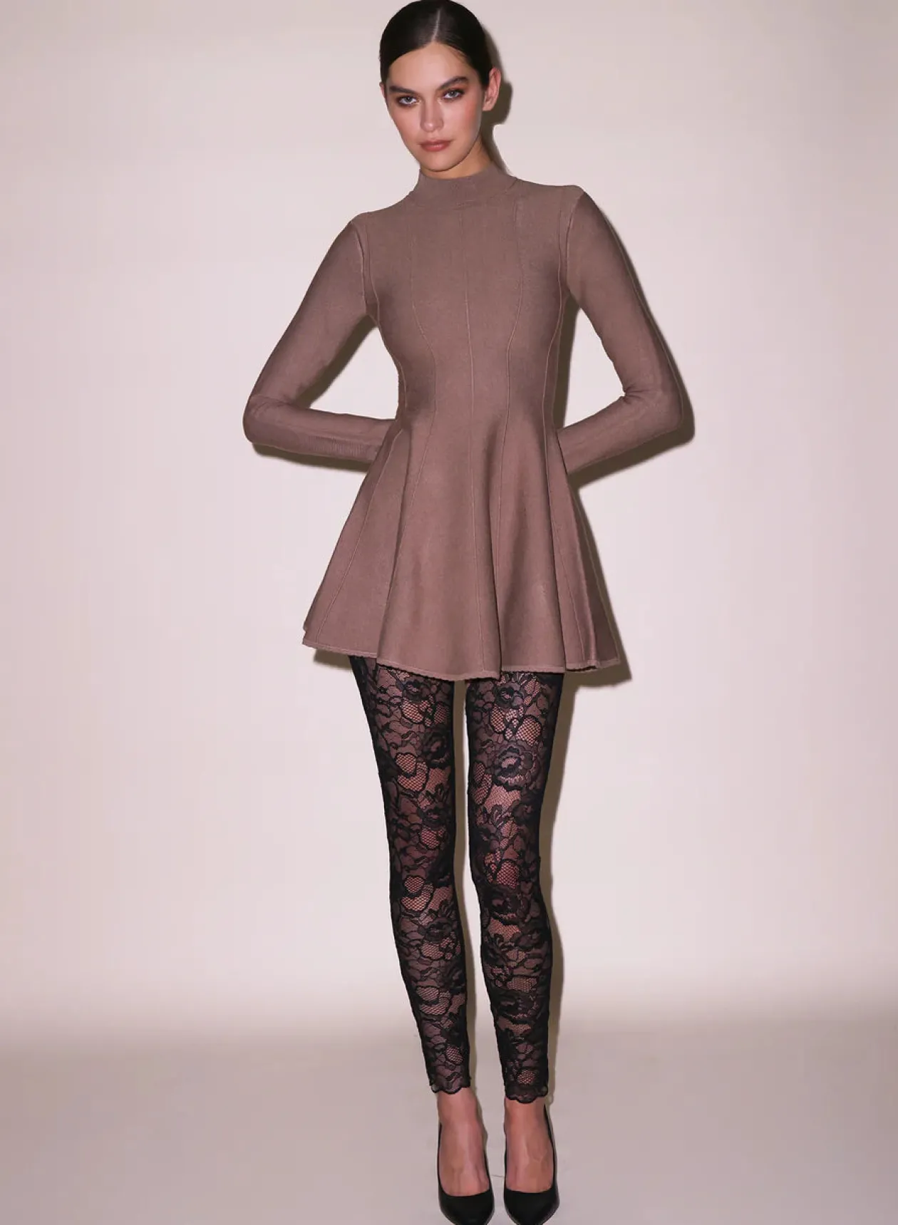 The Long Sleeve Flared Corset Dress in latte is a gorgeous mini dress, cut from soft stretch jacquard with corset seaming and boning to show off your waist. Features mock neck with exposed back zipper closure and playful flare skirt. Fitted style.