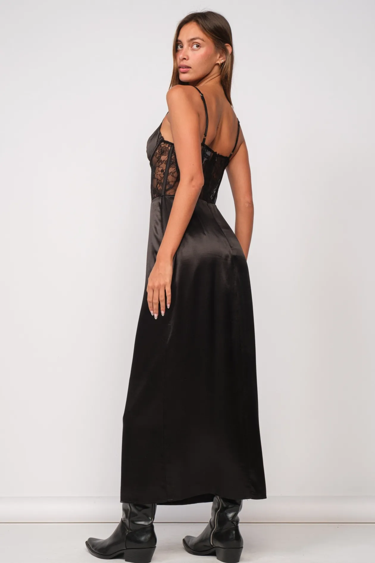 Our Lady of the Night Corset Maxi Dress is sure to turn heads, with its corset bodice and semi-sheer lace paneling. A long satin skirt shows off those curves in a way that’s sexy yet cool and classy.