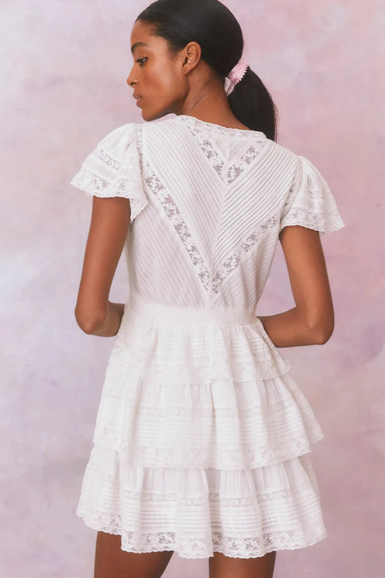 Introducing the Binselle Dress. This pretty mini features an airy, cotton fabric and begins with sweet flutter sleeves and a v-neckline. The flirty piece features custom lace detailing throughout, buttons down the center front, and a romantic, ruffle-tiered skirt with pintucking details all over. The back is smocked for easy and comfortable wear.