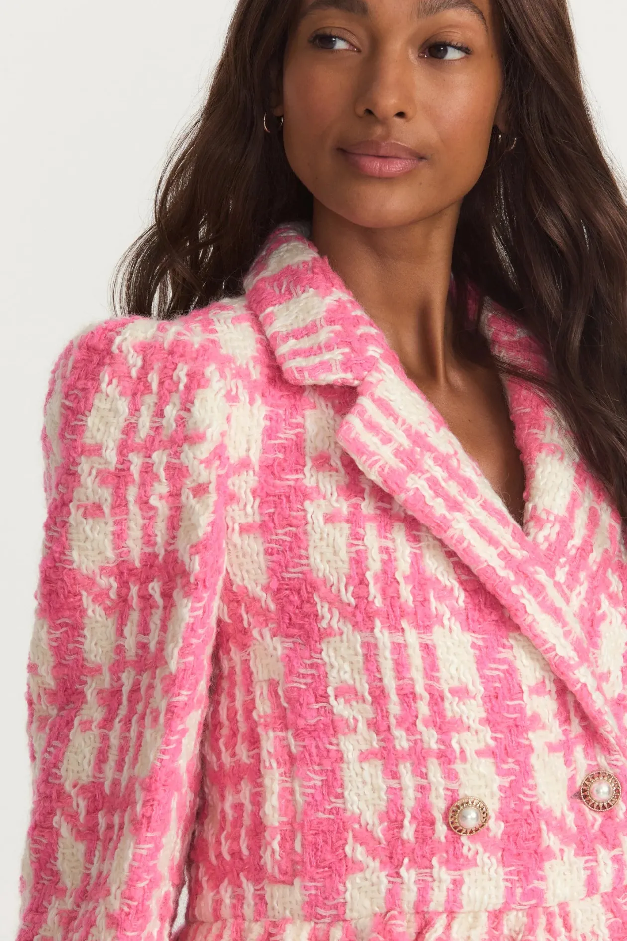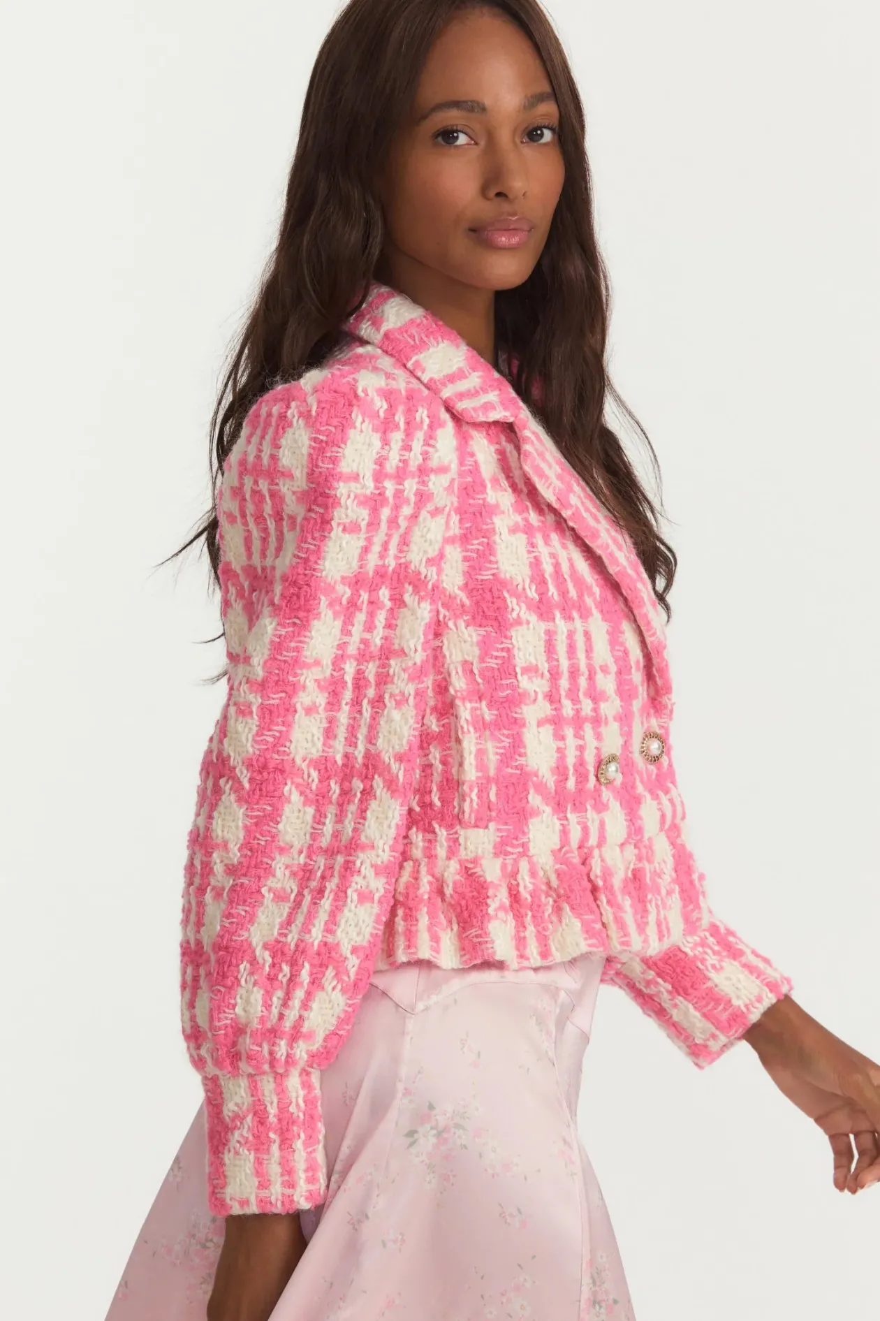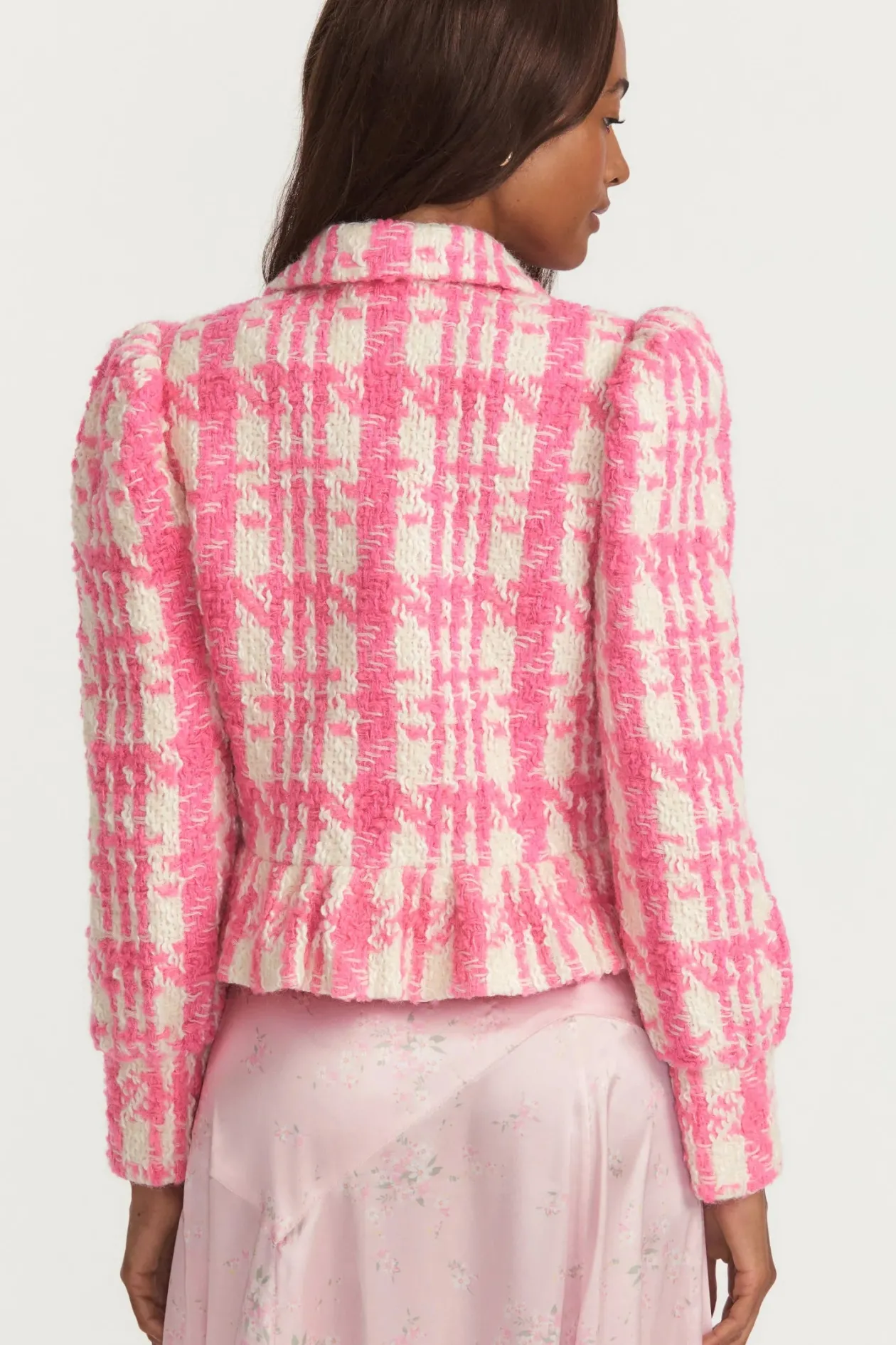 Our Braelynn Crop Jacket is cold weather perfection with a custom yarn dye houndstooth pattern. This fitted piece features a notch collar, shirred ruffle peplum at the hem, and an exaggerated shape.
