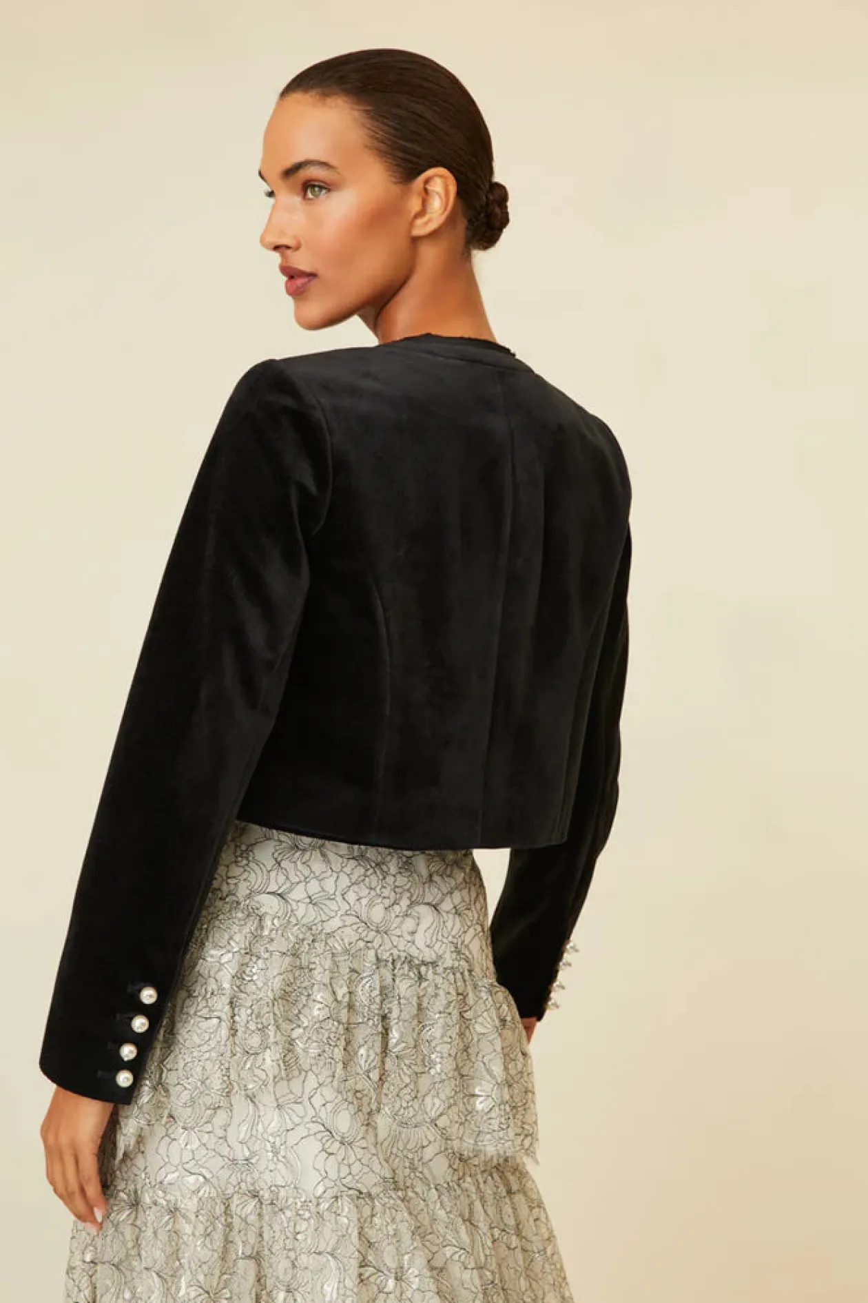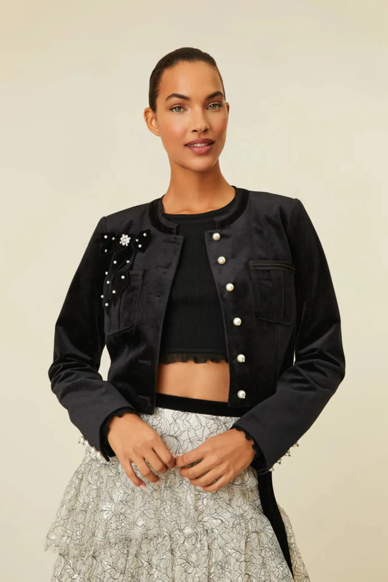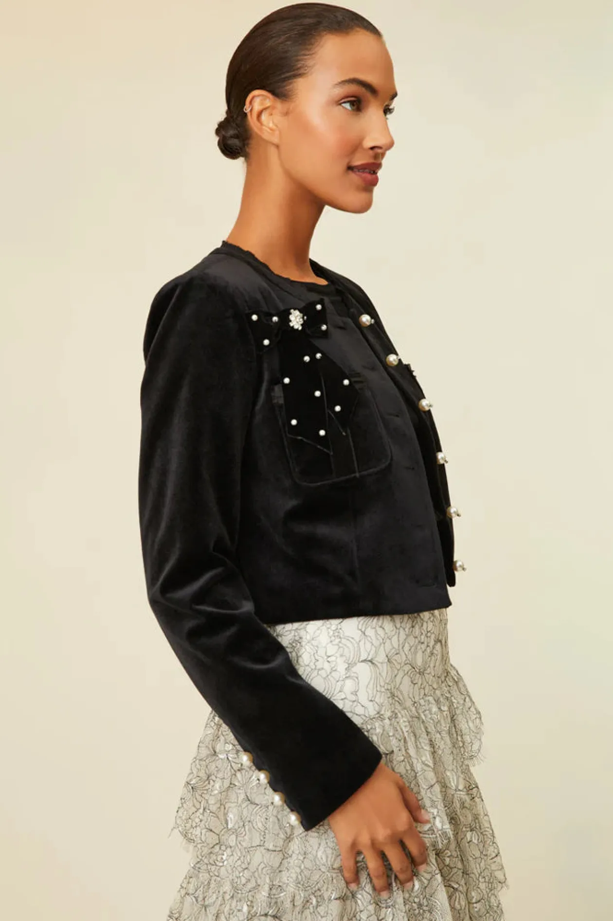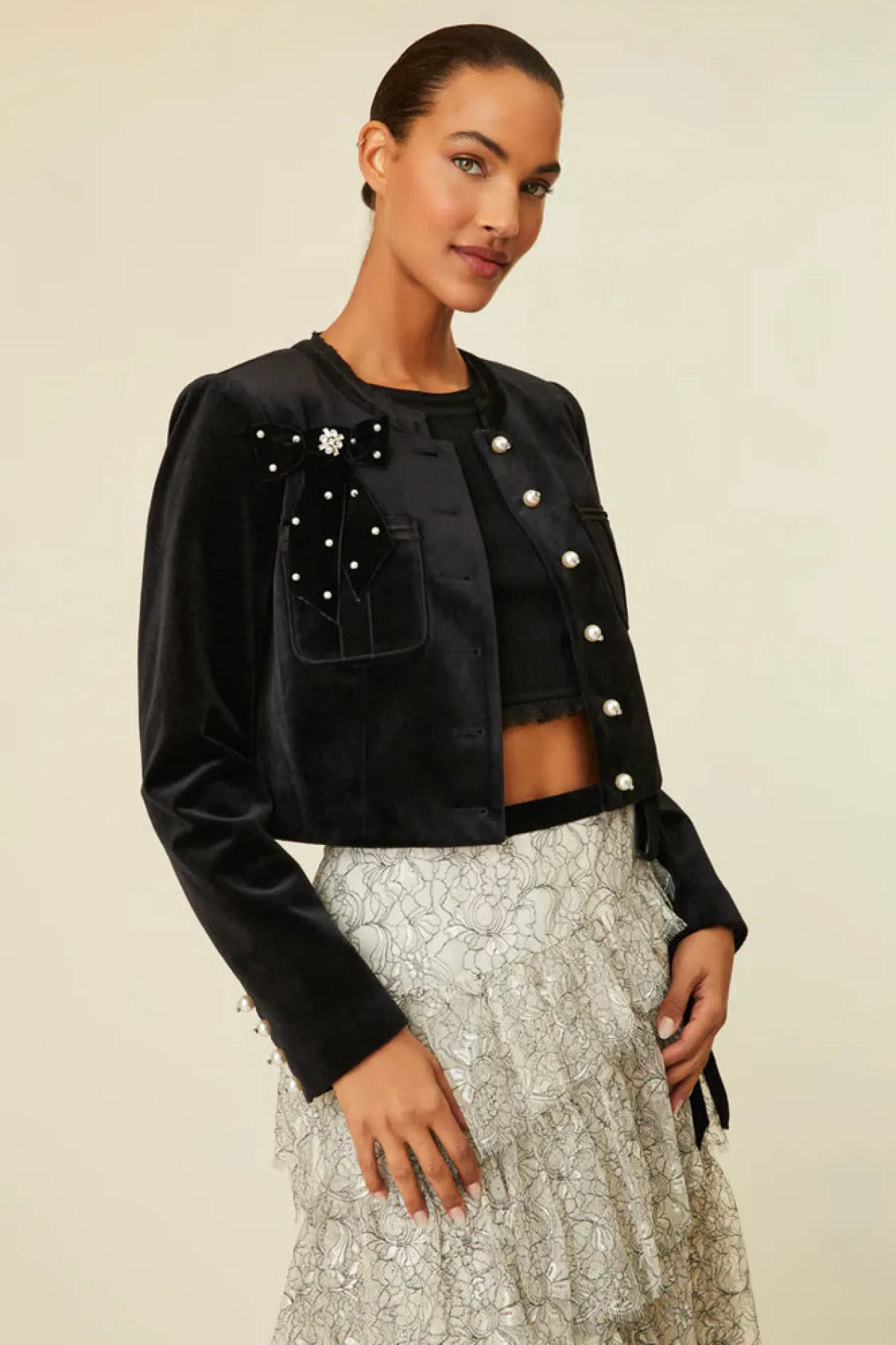 So in love with the Clarkson Jacket. Super sleek, this outerwear is designed with a luxe velvet fabric and features taffeta raw-edged trim at the neckline and above the pocket opening. This piece is adorned with pearl buttons with crystal embellishments on the center front and sleeve openings. The jacket has a removable velvet tape bow with gorgeous crystal pins and pearls.