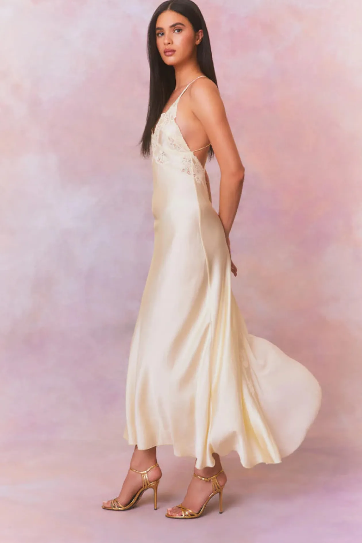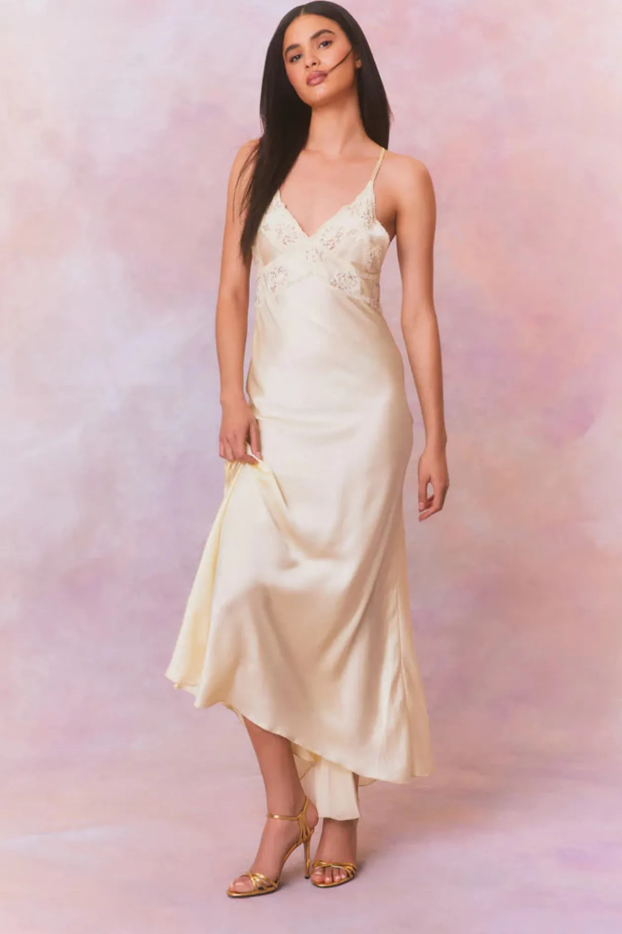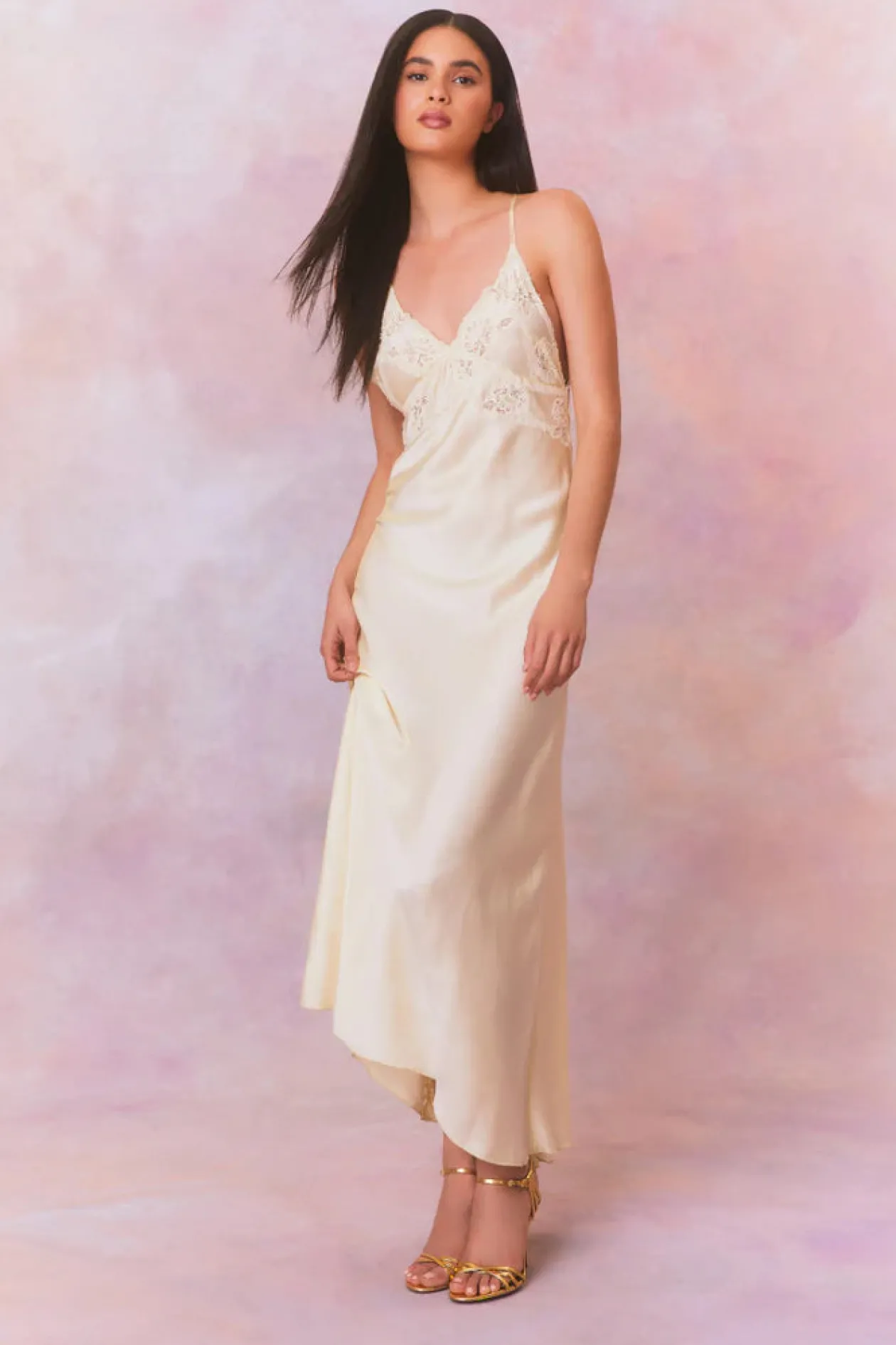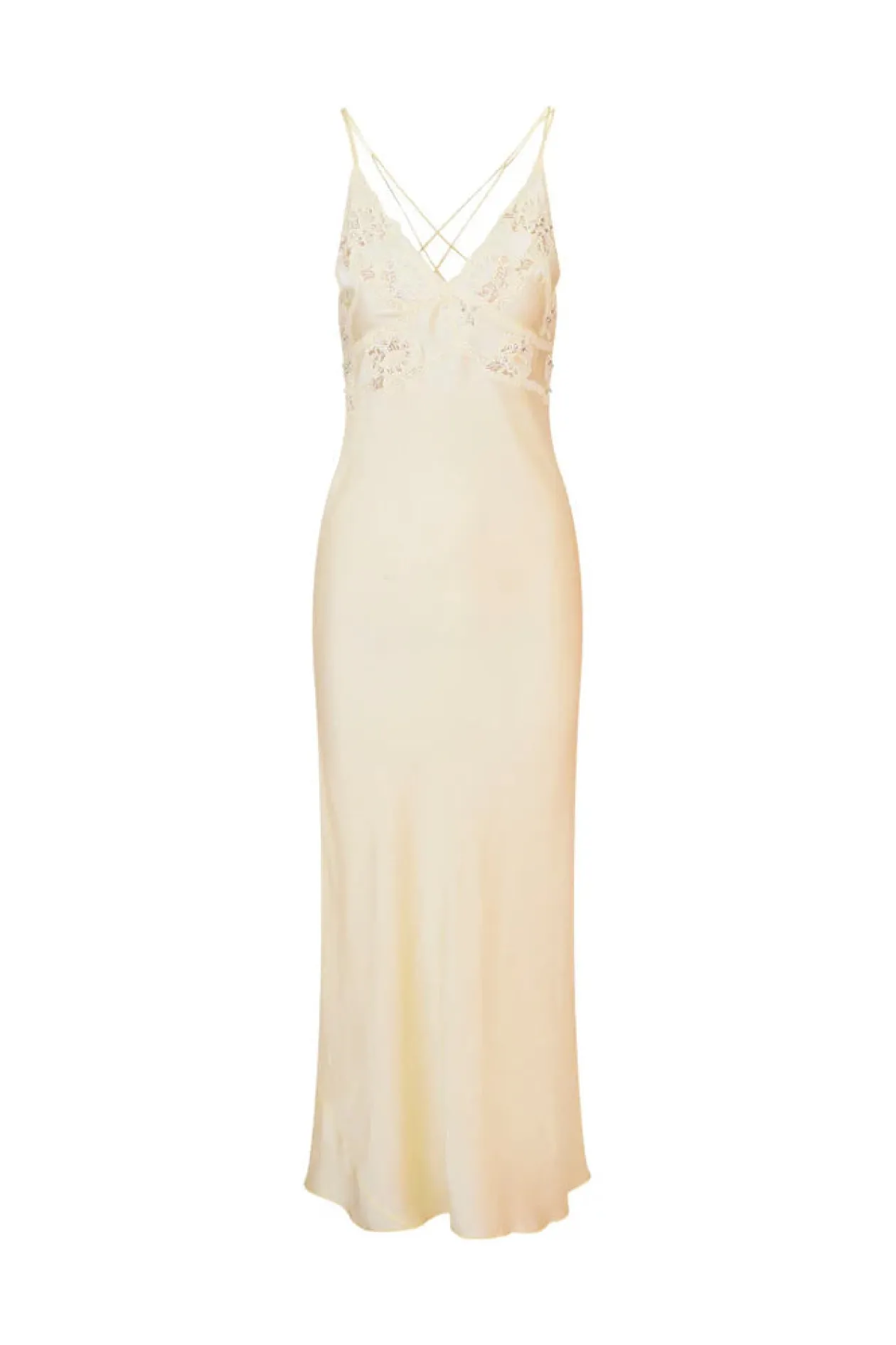 Effortlessly chic and feminine, the Kesslyn Dress makes its debut. This gorgeous, evening slip dress features a soft silk charmeuse fabric and double crossed straps over the back for a flirty look. The maxi stuns with intricate lace and floral embroidery detail at the bodice before descending to a flattering skirt.