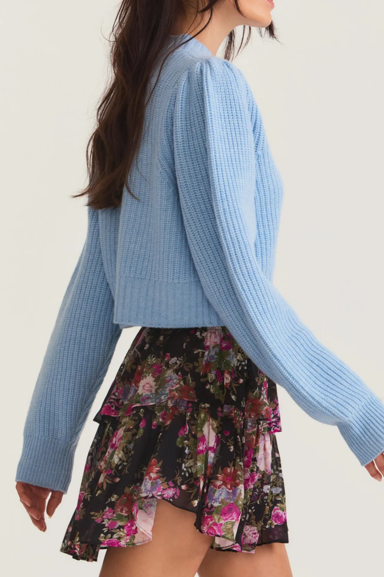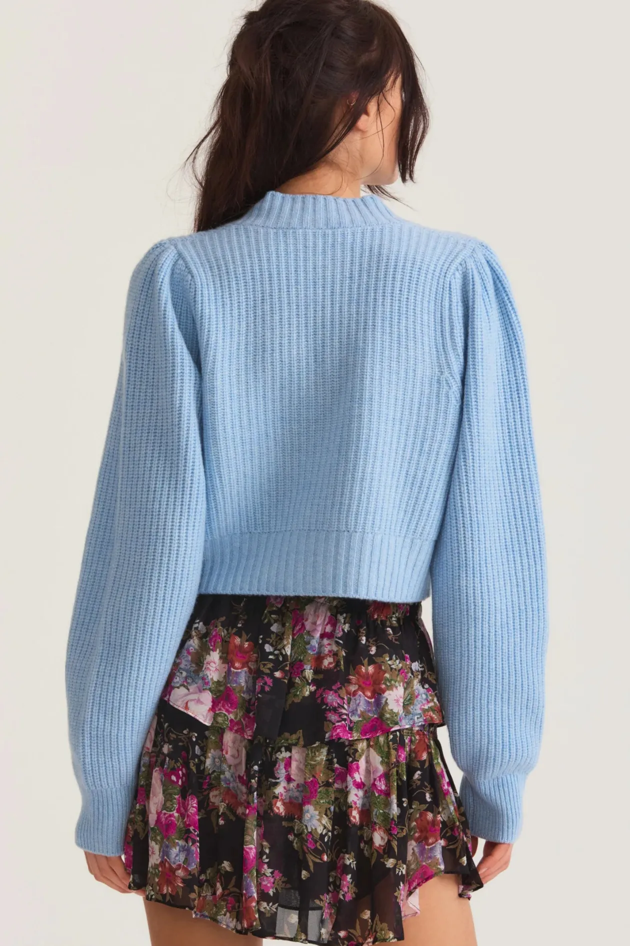 The Larsa Crop Cardigan is a cashmere-wool blend cropped knit sweater with a v-neck that descends to four buttons at center front. Pleated blouson sleeves extend to ribbed cuffs at opening. Featuring a top applied embellished butterfly detail on wearers right.
