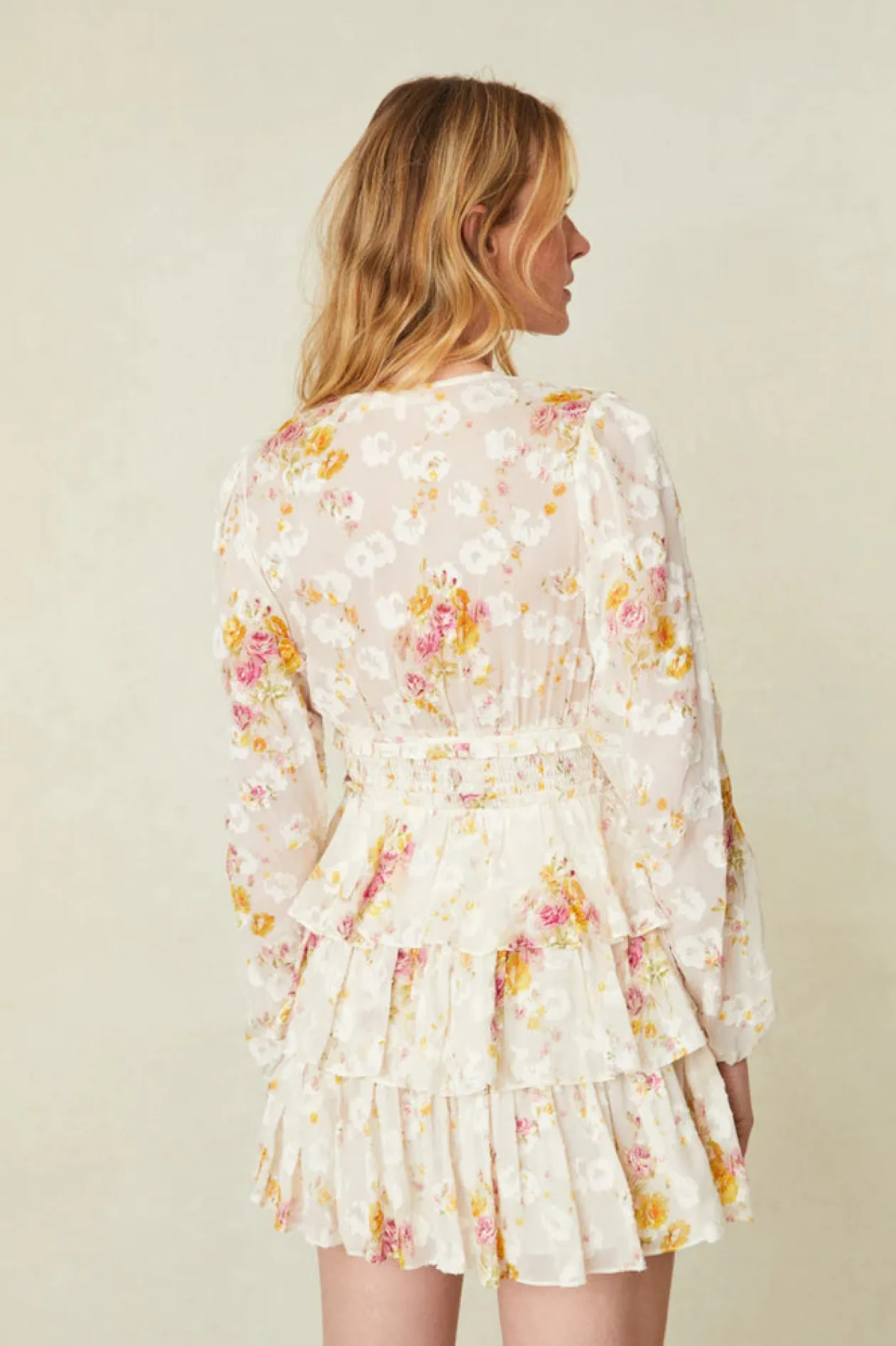 Introducing the Madina Dress. Feeling pretty in this fall floral printed mini. The dress features long blouson sleeves, a slight v-neckline, ties at center front, a slightly ruched bodice, and a multi-tiered skirt.