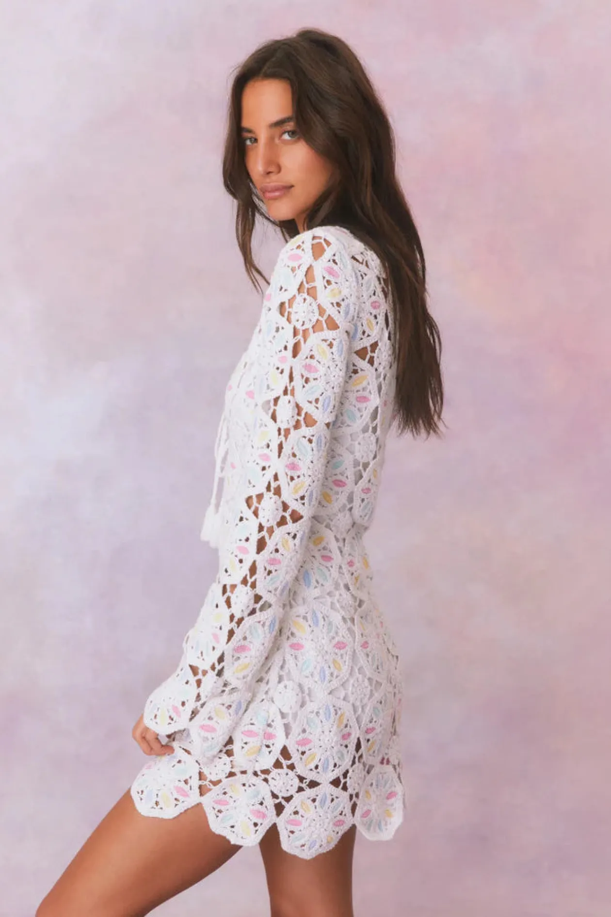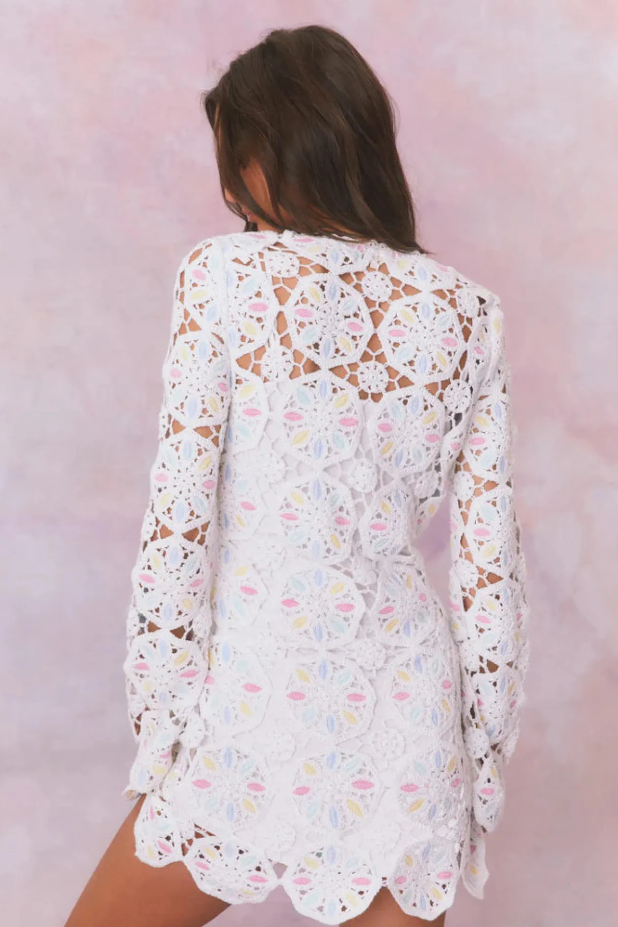 Boho chic in the Poemes Dress. This dreamy mini stuns with our gorgeous wheel-shaped crochet fabric featuring pastel colors mixed in all over ideal for warm weather days. The beachy dress has a body skimming silhouette, a deep v-neck, and drawcord tassels. The piece comes with a separate mini slip lining.