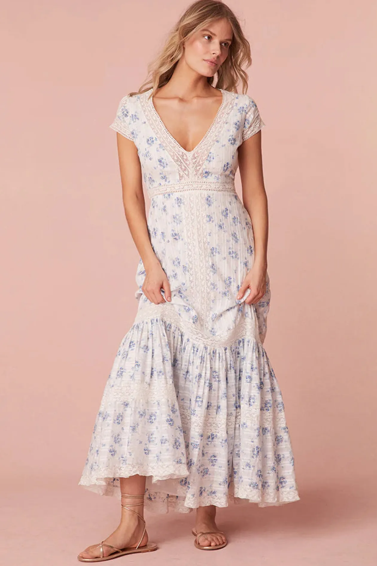 Introducing the Vermella Dress. Our dream springtime frock makes her debut with an airy, cotton fabric featuring our dreamy blue floral print of the season and intricate, lace detail all over. The midi begins with short sleeves and a v-neckline lined with lace that descends down center front into a sweeping, pleated skirt with lace insets that falls to a lace hem.