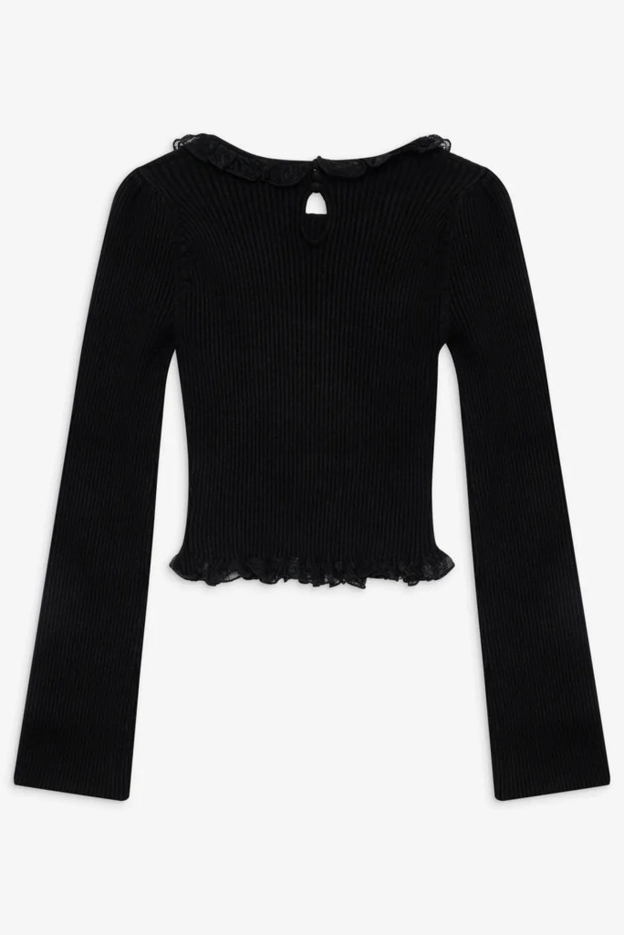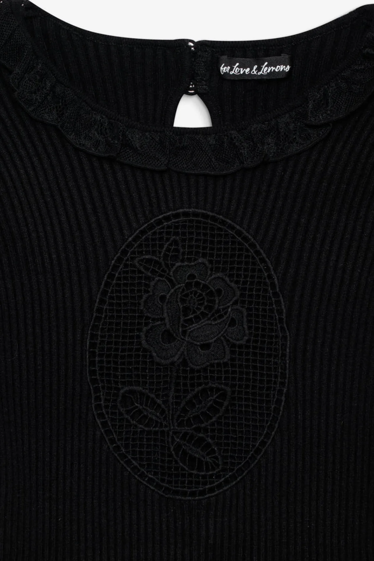 Inspired by vintage motifs, the Lyon black knit top shows off an inset rose cameo at the bust. This slightly cropped sweater is crafted in a ribbed knit and features a high neck with a lace ruffled trim.