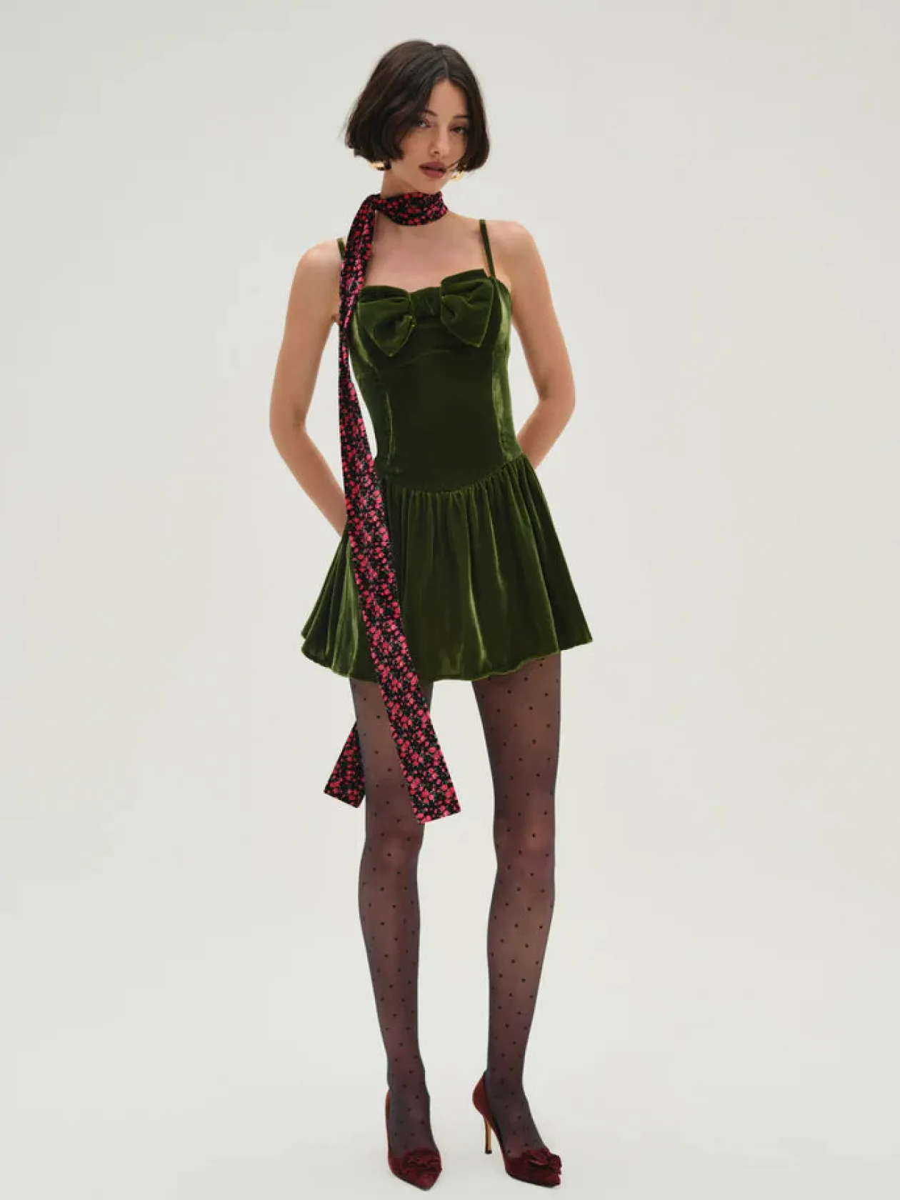 Inspired by our favorite holiday cocktail, the Martini Olive green mini dress is the perfect party dress for the festive season. Featured in a vibrant jewel tone, this velvet dress is cut to a drop waist with a gathered skirt and is adorned with a large velvet bow at the neckline.