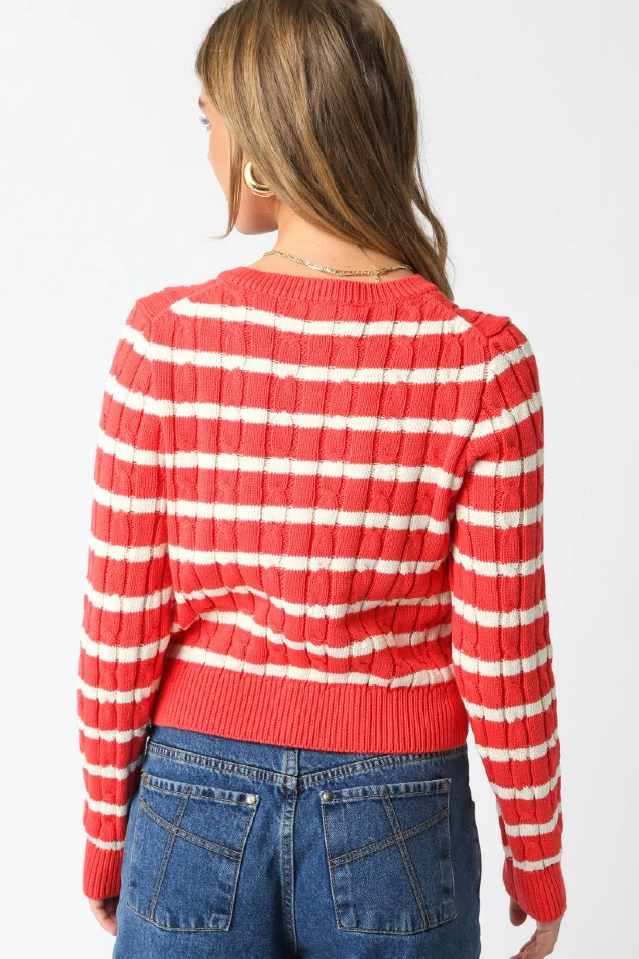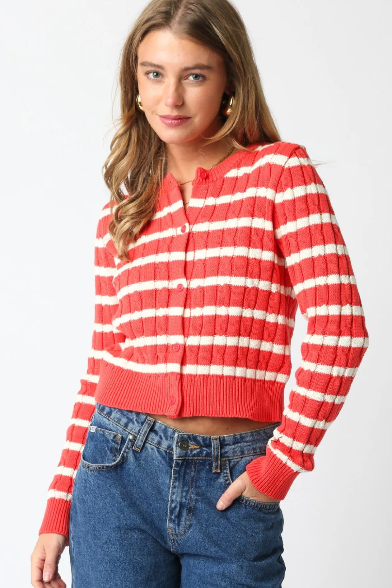 Our Millie Sweater features a button down and a cropped fit
