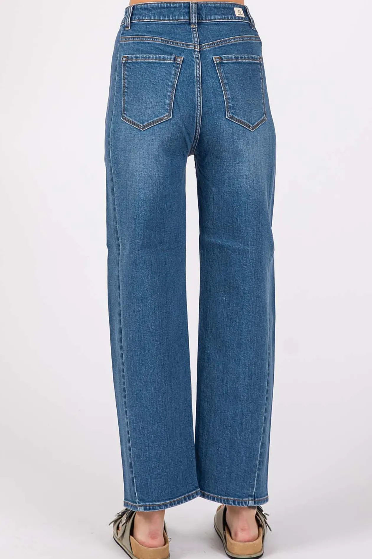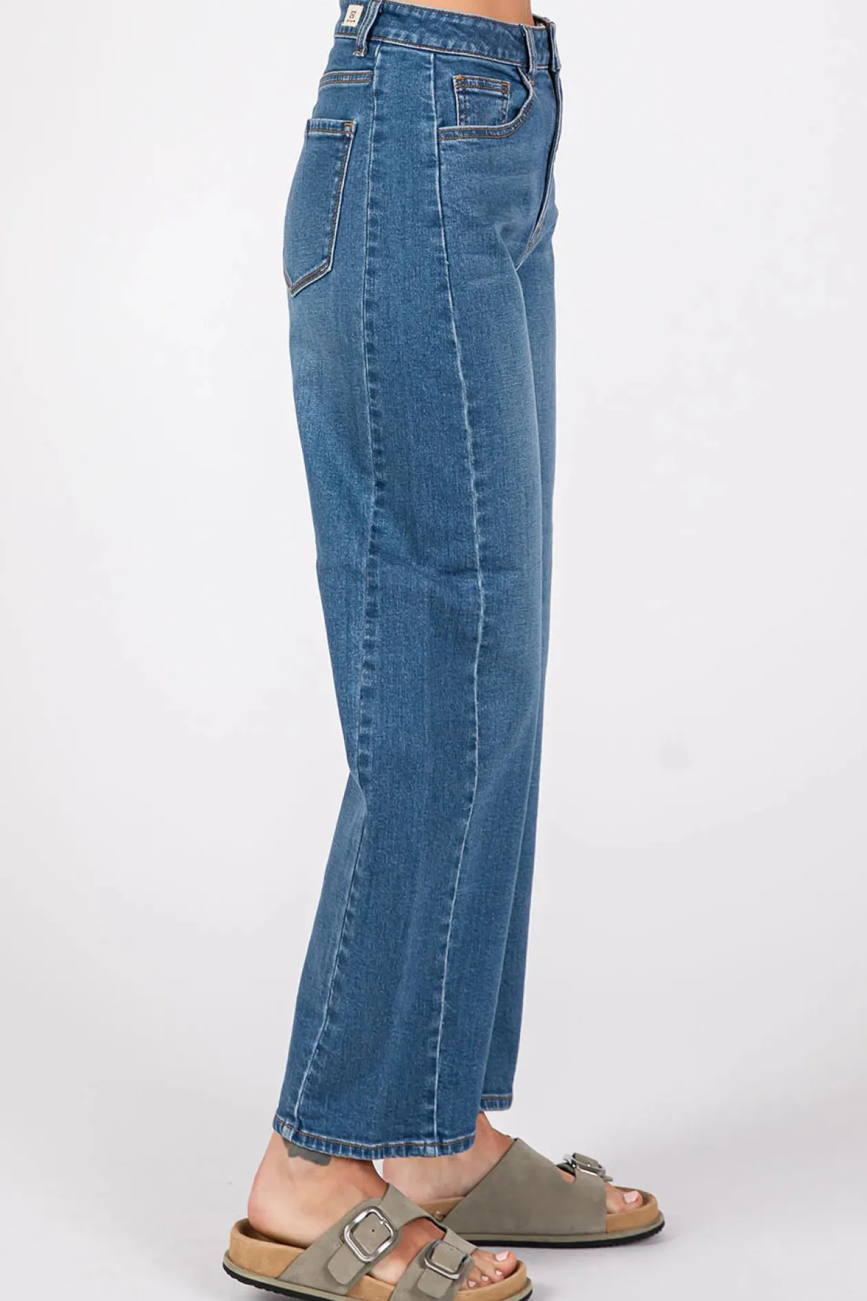 The Modena Barrel Jean is a medium wash high rise barrel jean with side paneling.